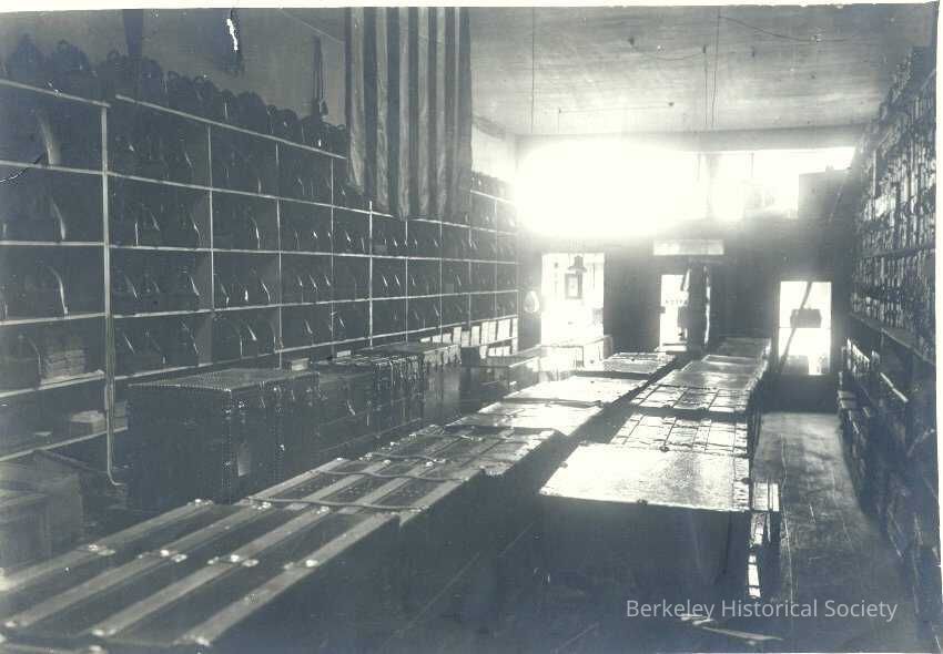 Interior with rows of trunks, suitcases and other items on shelves on either side. 2110 Allston Way.