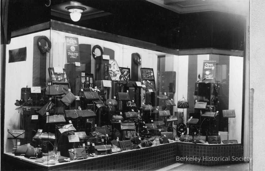 Christmas window display at Taylor's Leather Goods. 2213 Shattuck Avenue.