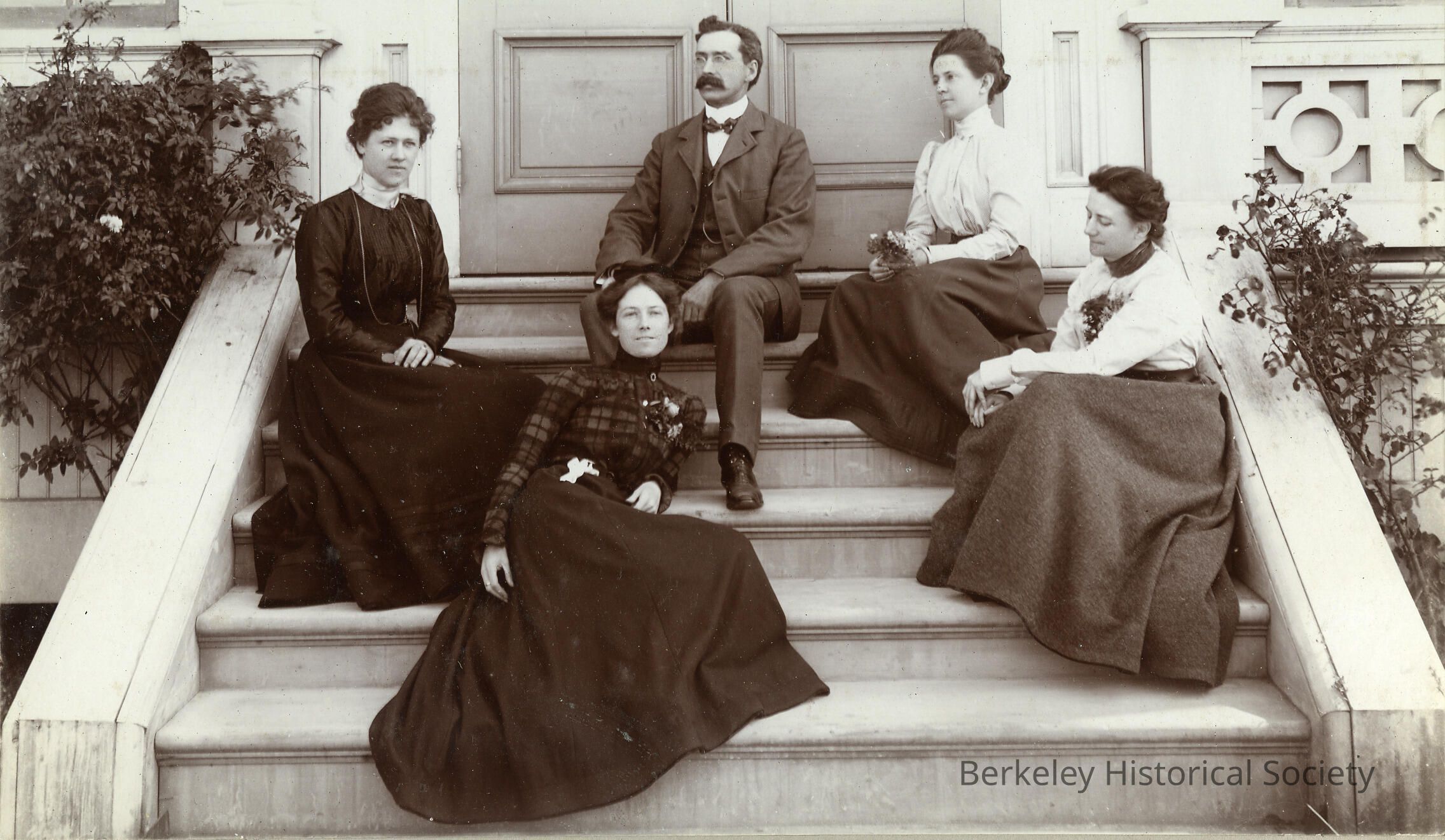 Teachers (possibly Columbus School) sitting on the stairs, group of four women and one man