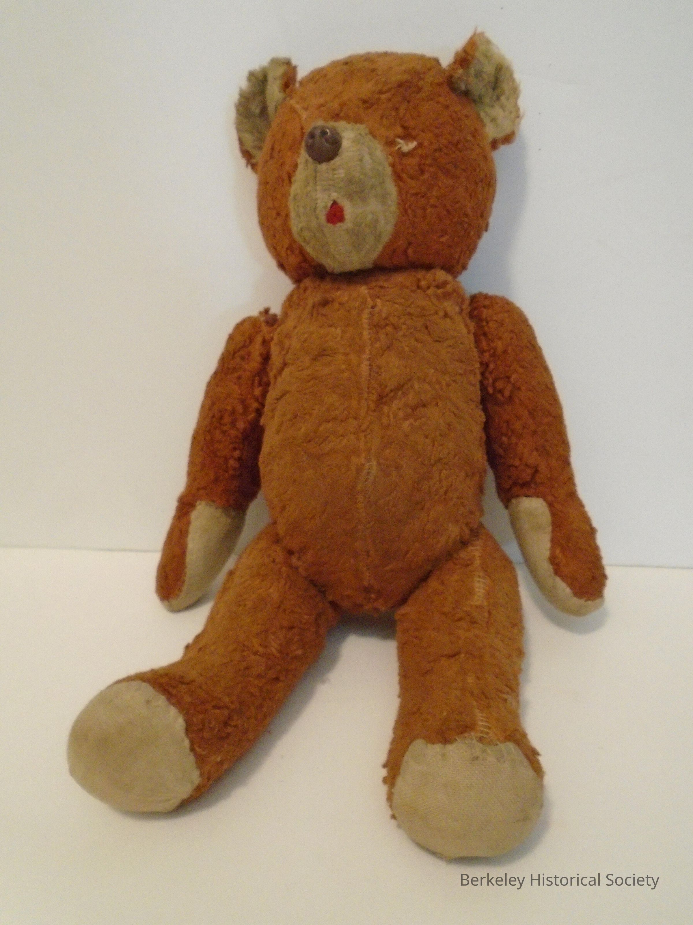 Toy, stuffed animal, teddy bear. Hard stuffed body with squeaker not working in back. Brown fluffy outer layer with once white face, paws, feet, ears. Missing eyes (button). Arms and legs not designed to move.Made/Created