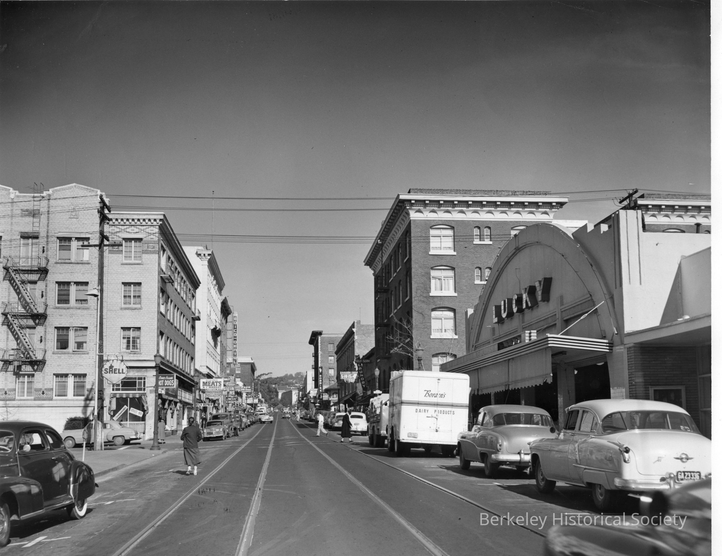 Lucky Market, Coney Island Hot Dogs, Shell Service Station, Euclid Dental Building, Streetcar tracks, Self Serve Laundry, Streetscape