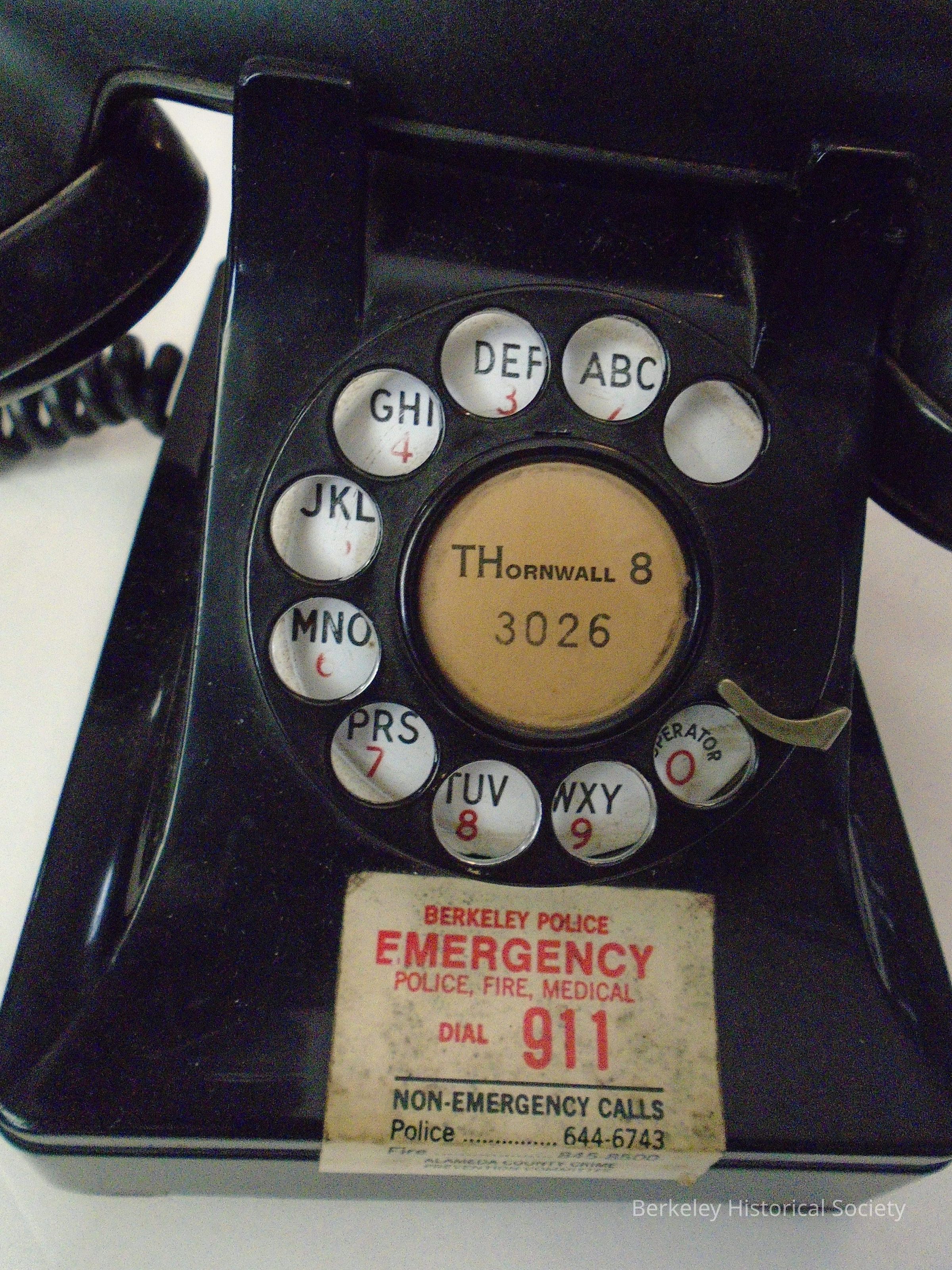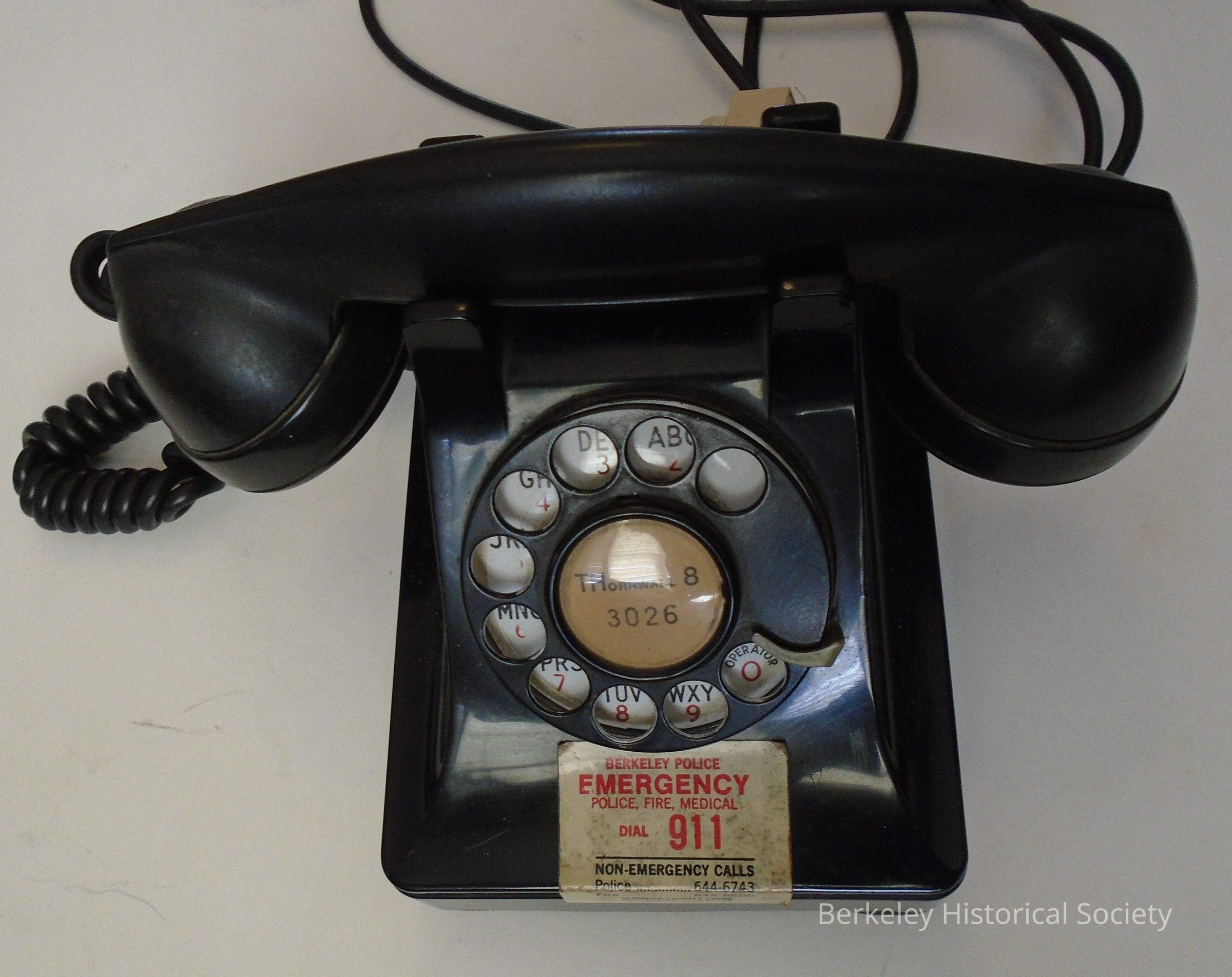 Black dial/rotary telephone with number THornwall 8-3026. Includes coiled cord to attach handset/receiver and a cord from phone base to connect to phone line. Numbers and letters located in finger holes. Made of metal and thermoplastic.Made/Created