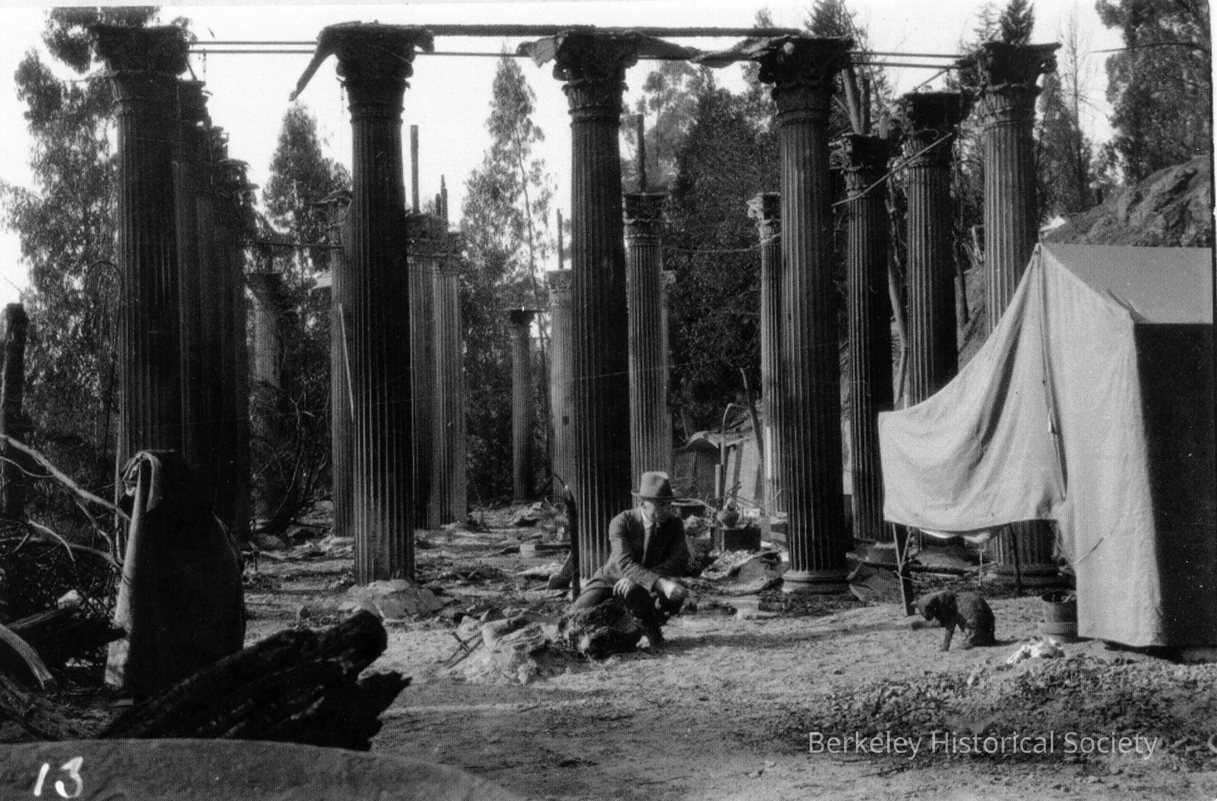 Ruins after 1923 fire; man crouched down gesticulating to cat; tent to the right. '13' in bottom left of photo.Other Names and Numbers