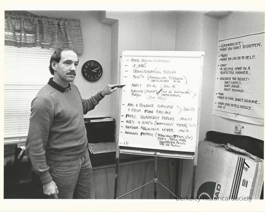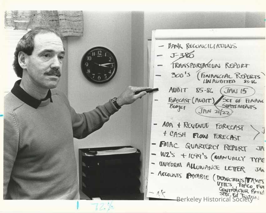 Business manager, BUSD. Pointing to items on a flipchart. 2 photographs.