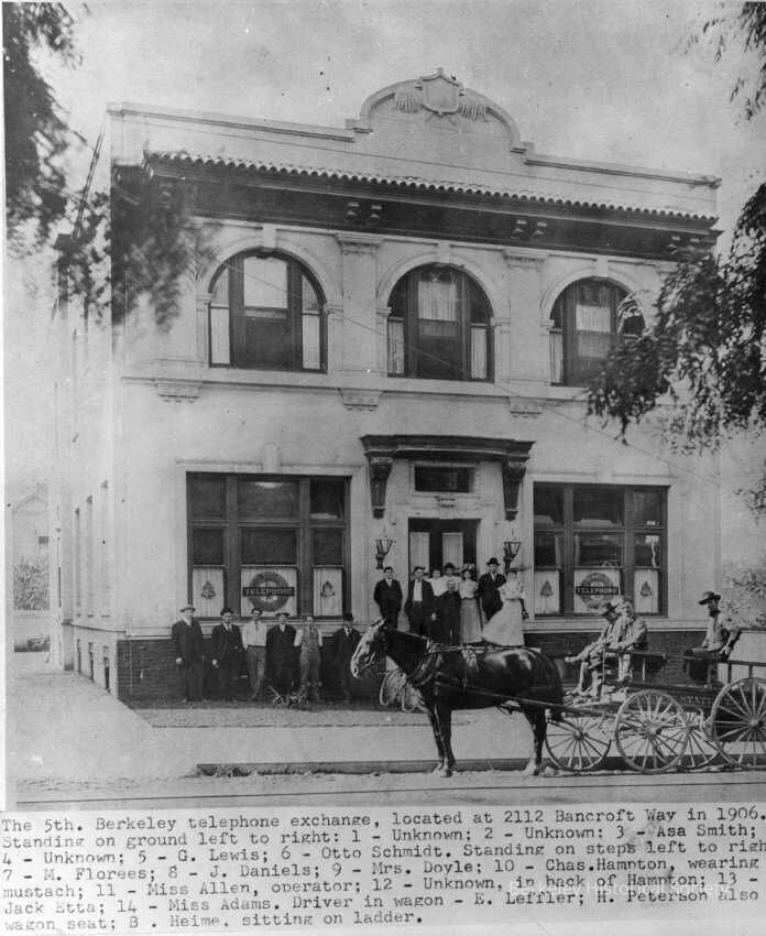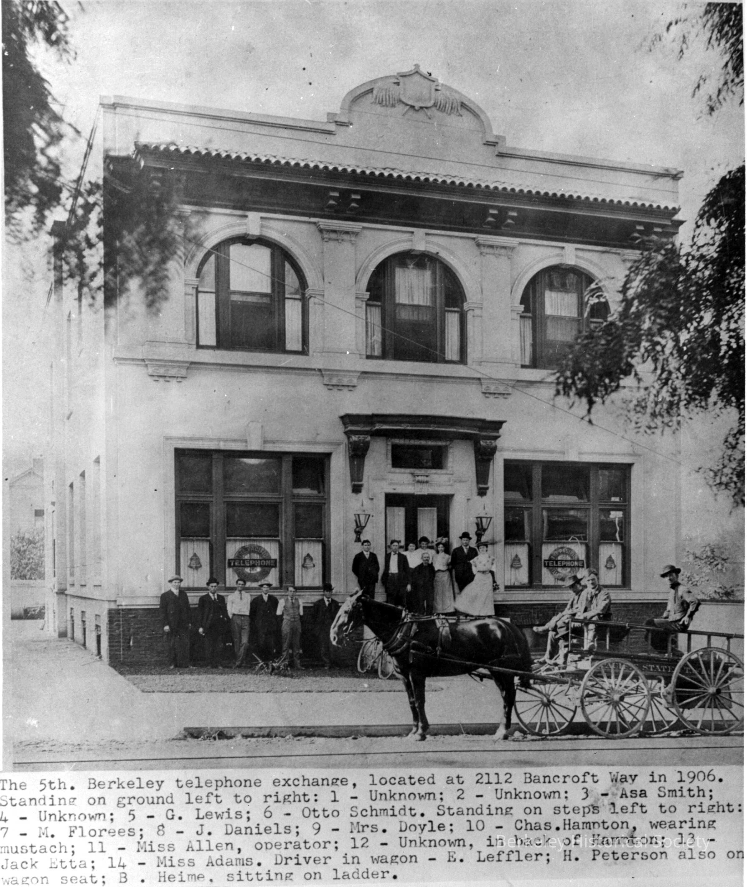 The 5th Berkeley telephone exchange, located at 2112 Bancroft Way in 1906, Standing on ground left to right: 1 - unknown, 2 - unknown, 3 - Asa Smith, 4 - unknown, 5 - G Lewis, 6 - Otto Schmidt. Standing on steps left to right: 7 - M. Florees, 8 - J. Daniels, 9 - Mrs. Doyle, 10 - Chas. Hampton (wearing mustache), 11 - Miss Allen, 12 - Unknown (in back of Hampton), 13 - Jack Etta, 14 - Miss Adams. Driver in wagon - E. Leffler, H. Peterson also on wagon seat, B. Heime sitting on ladder.Made/Created