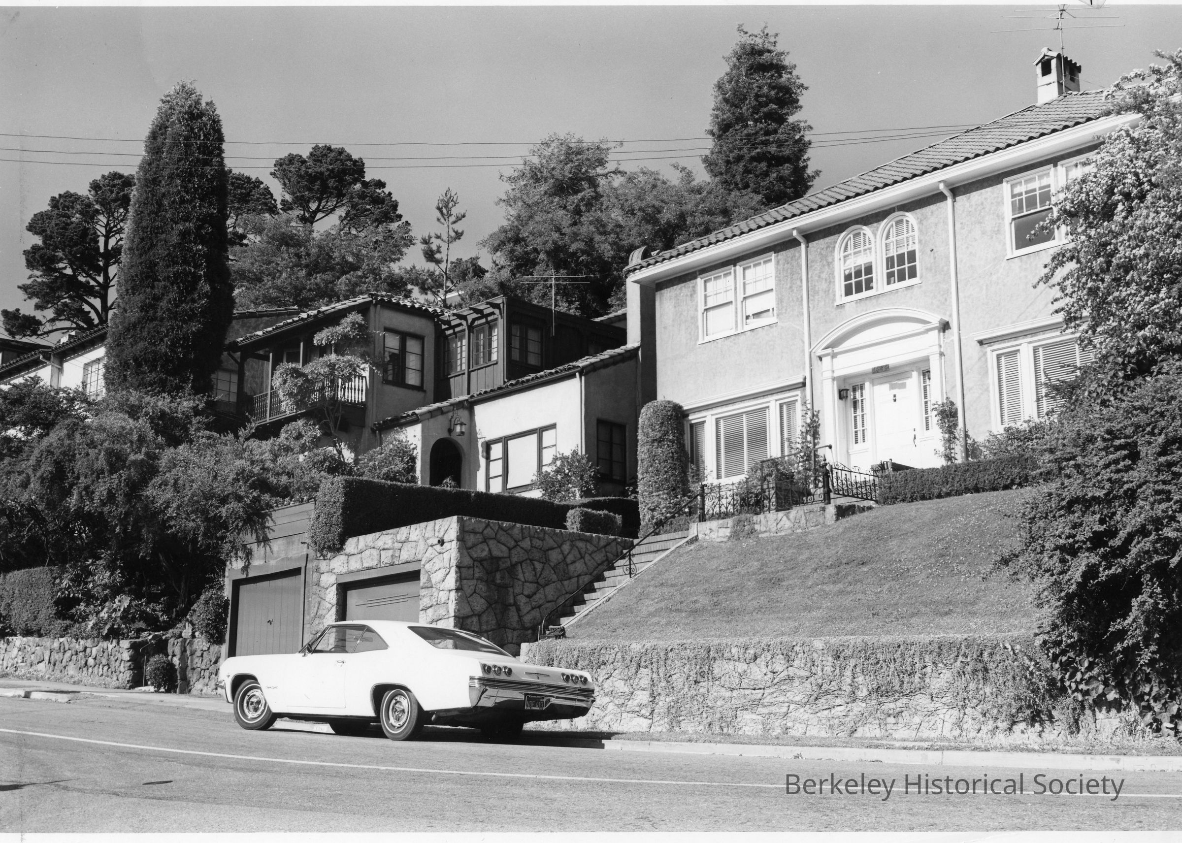 Homes on The Alameda. possibly north of San Lorenzo Avenue. Chevrolet parked on street is 1965 model.