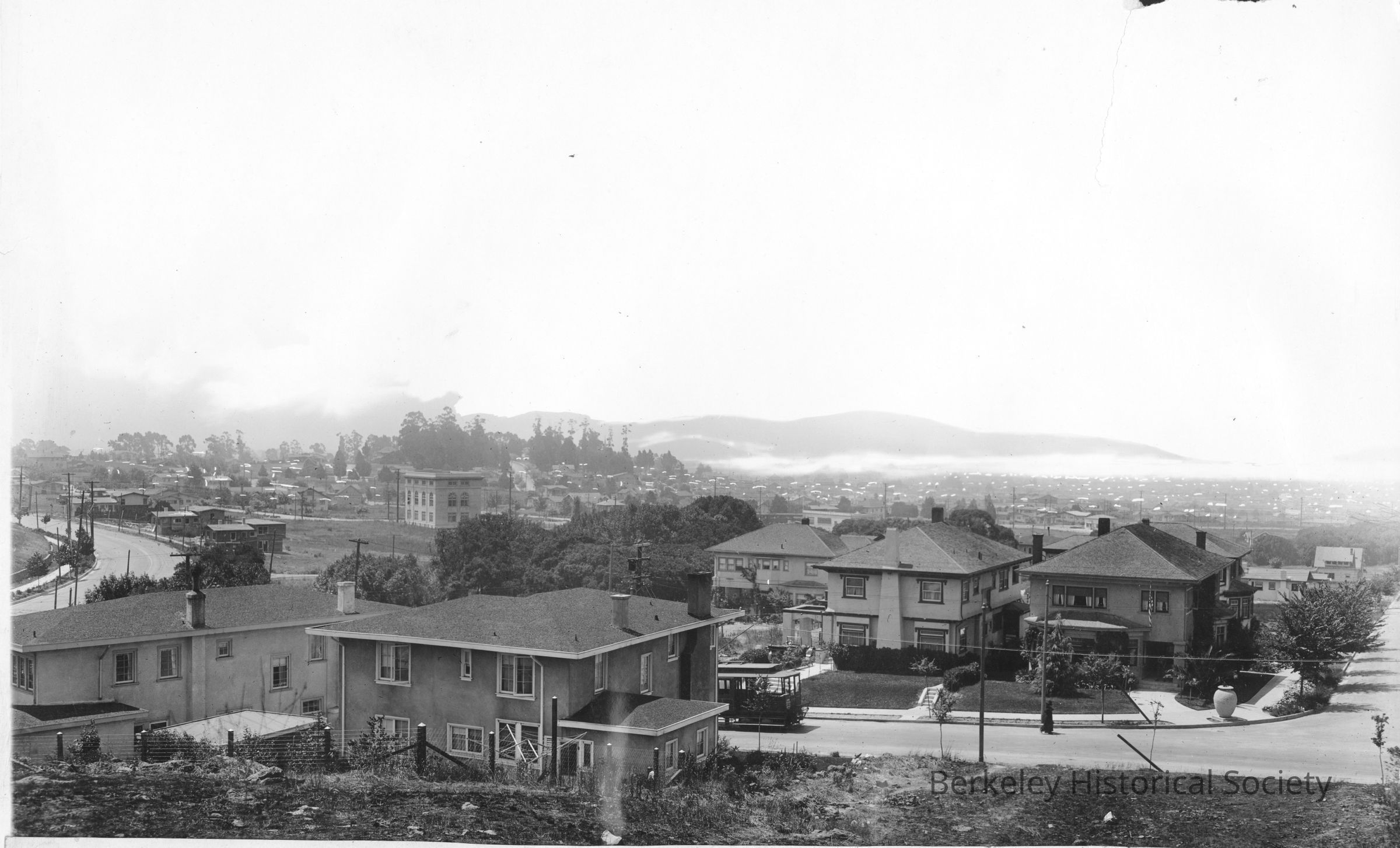 Homes on The Alameda; streetcar on street. View to southwest to bay, power station on Solano Avenue in distance.