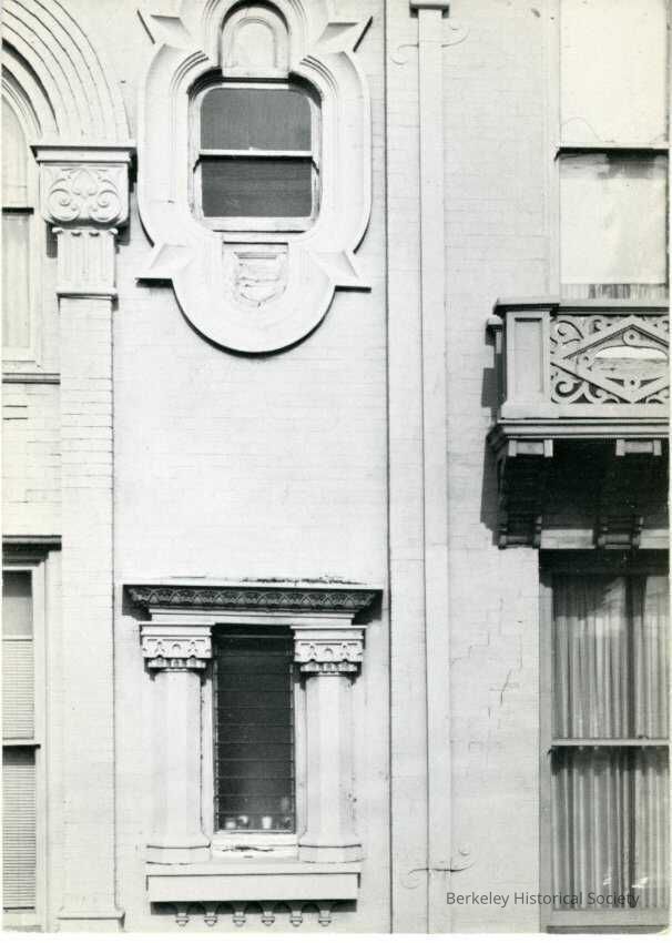 Postcard featuring black and white photograph of the Barker Block building. Photograph is a close up of two small windows surrounded by architectural details, half of an arch and parts of four other windows. 2486 Shattuck Avenue