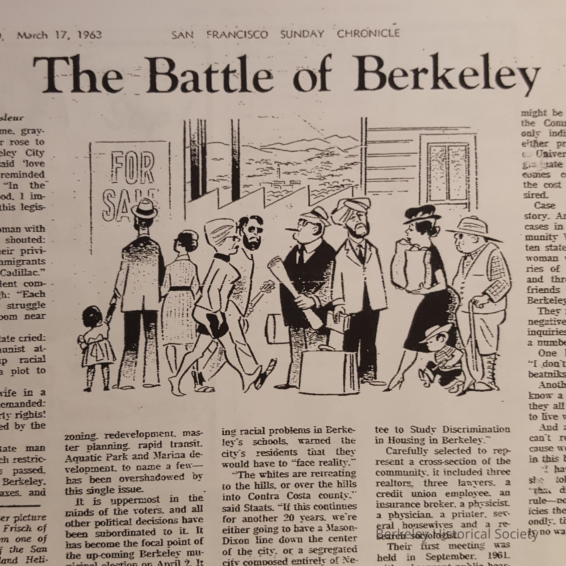Article concerning the proposed city council Ordinance 3915 N.S. which would prohibit discrimination in housing, affecting sale, rental or lease of homes and apartments in Berkeley. Article appeared in the San Francisco Chronicle, This World section, 3/17/1963.