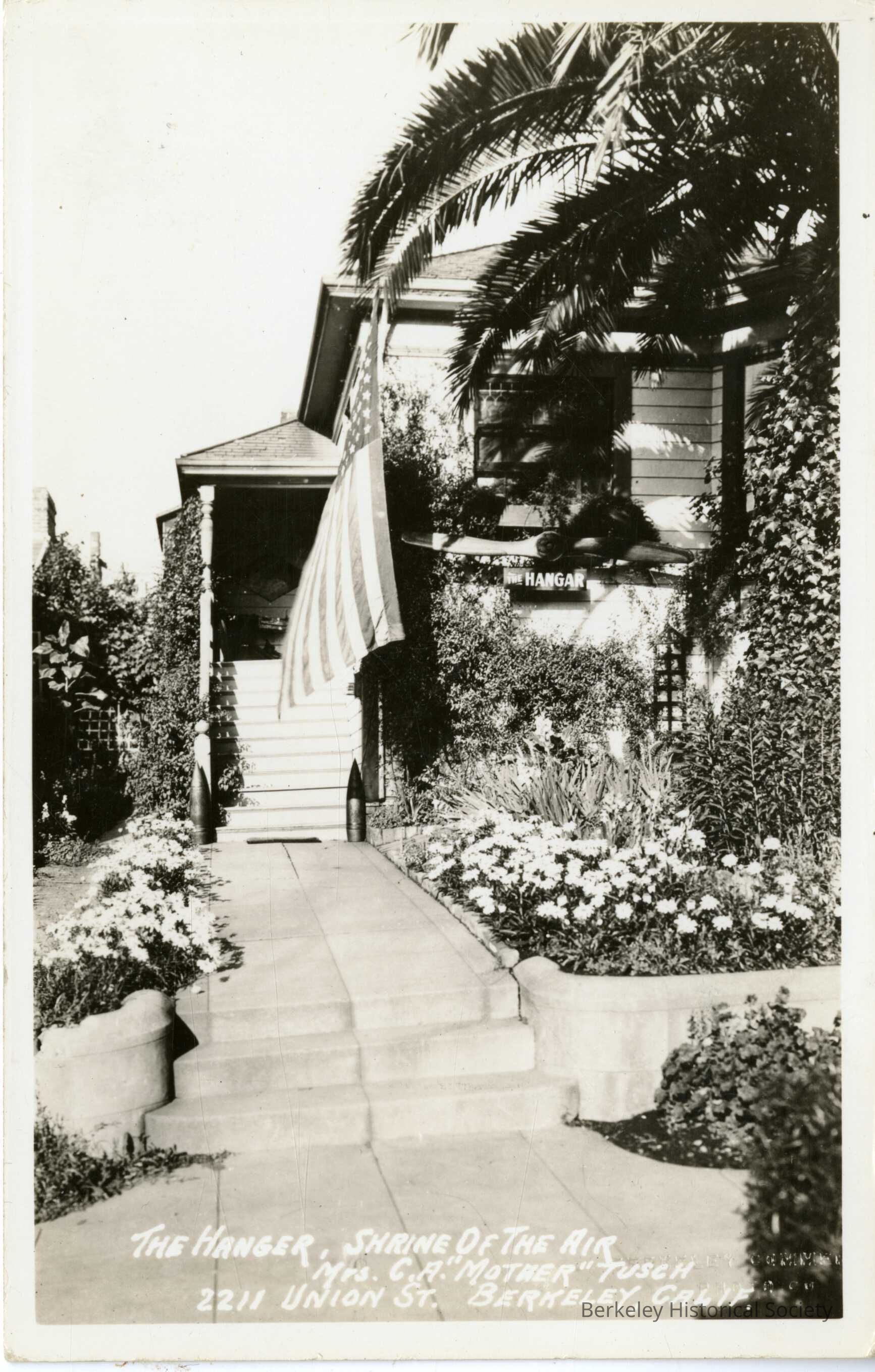 Postcard featuring black and white photograph of the entryway to a house with an airplane propellor out front. Text reads "The Hanger, Shrine of the Air, Mrs. C.A. "Mother" Tusch." No message present.