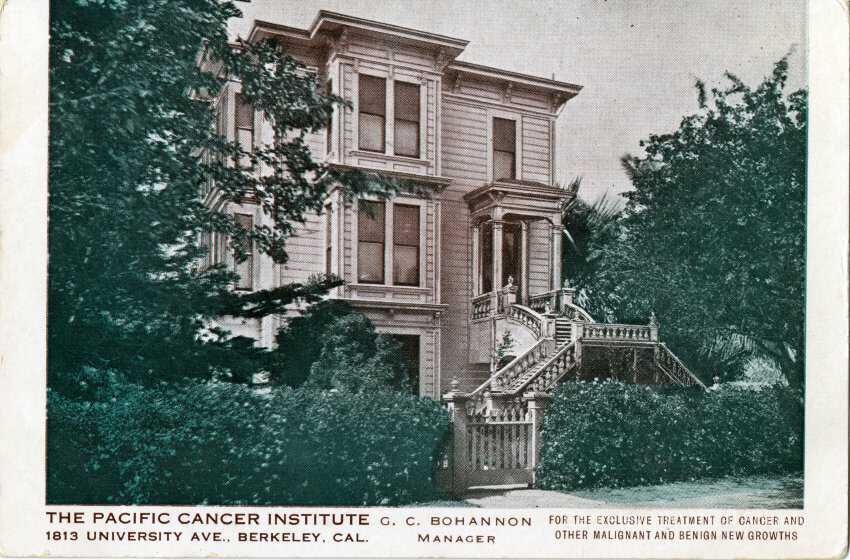 Divided back advertisement postcard featuring color image of The Pacific Cancer Institute located at 1813 University Ave. Postmark and stamp present.. G. C. Bohannon, manager.