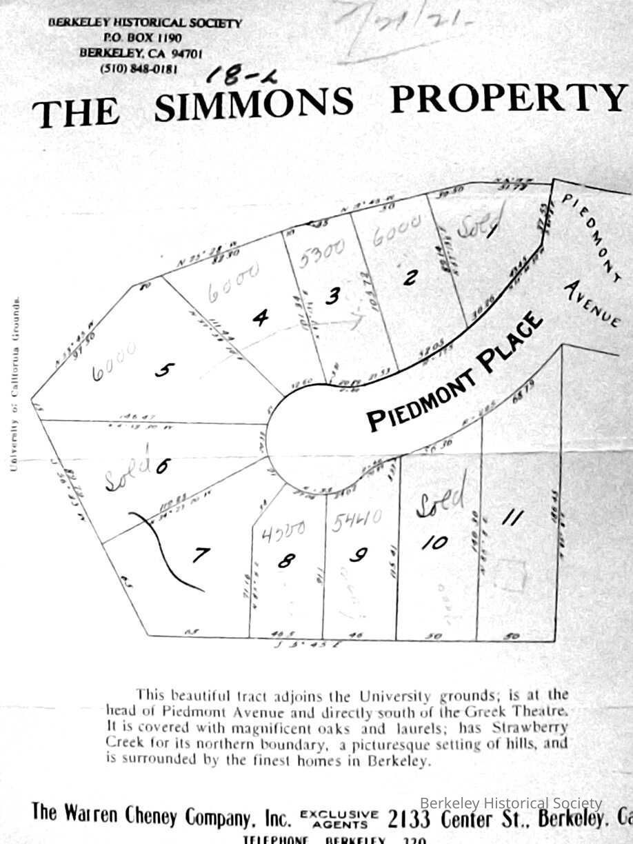Piedmont Place, at Piedmont Avenue The Warren Cheney Company. Part of sales brochure; adjacent to university grounds. Warrne Cheney Company, exclusive agents. "2/21/21" added in pencil.