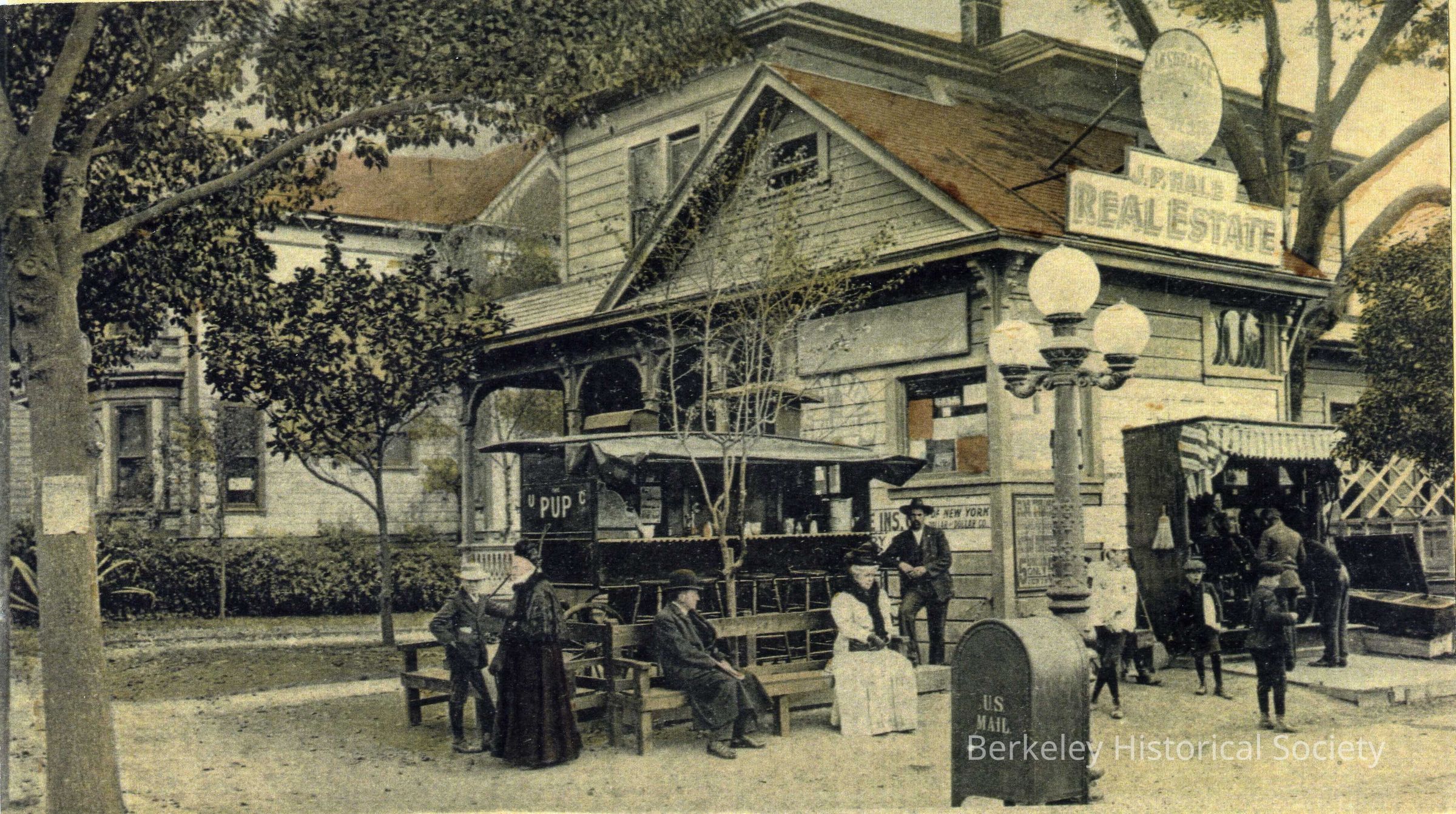 Copy of a Postcard printed in German of The U.C. Pup hot dog stand with J.P. Hale Real Estate building next to it. 1504 Shattuck Avenue.