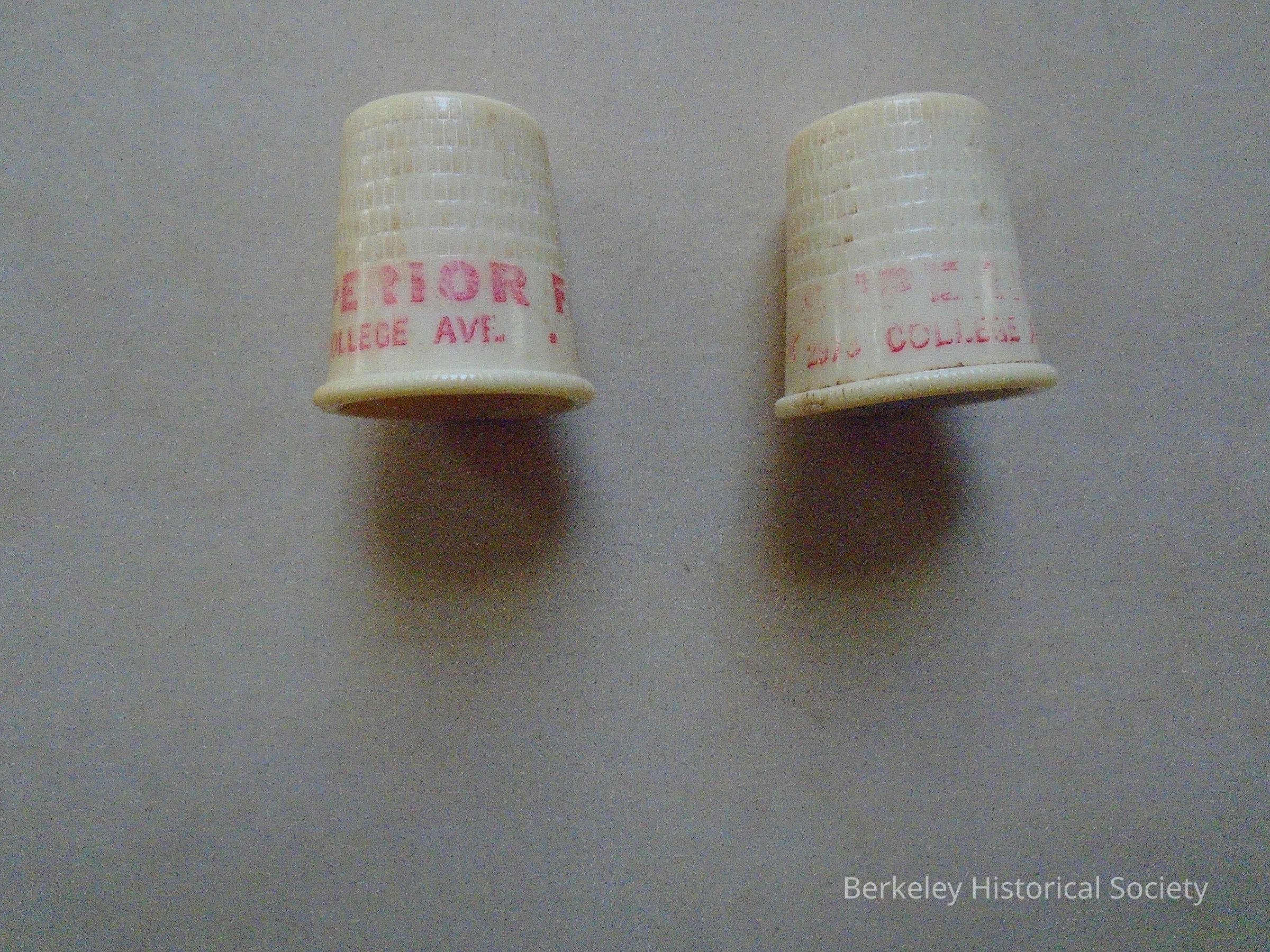 2 white plastic thimbles stamped in red "Superior Fabrics 2973 College Av. Berkeley 7-3939". See also Shafer Family (paper) Collection in upstairs archives. See also a brief Family History in Object ID # 1995.002.001.