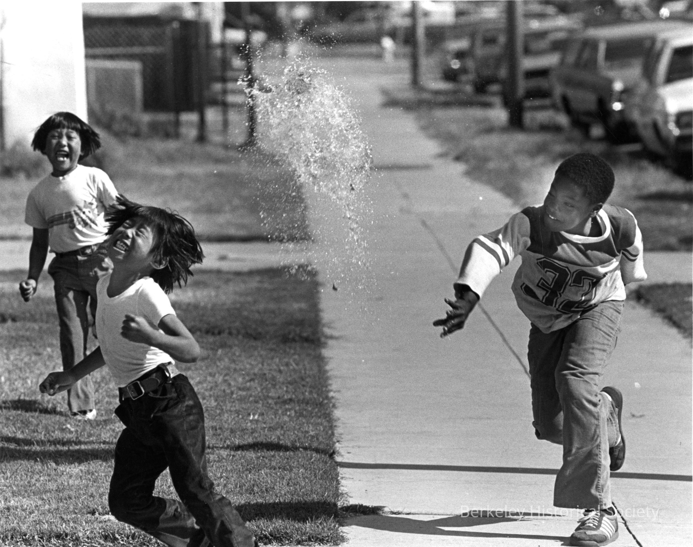 Children laughing; one throwing water balloon. Photo taken at 6th and Hearst. William and Freddie Aragon, and Jacobian Lemmons.Other Names and Numbers