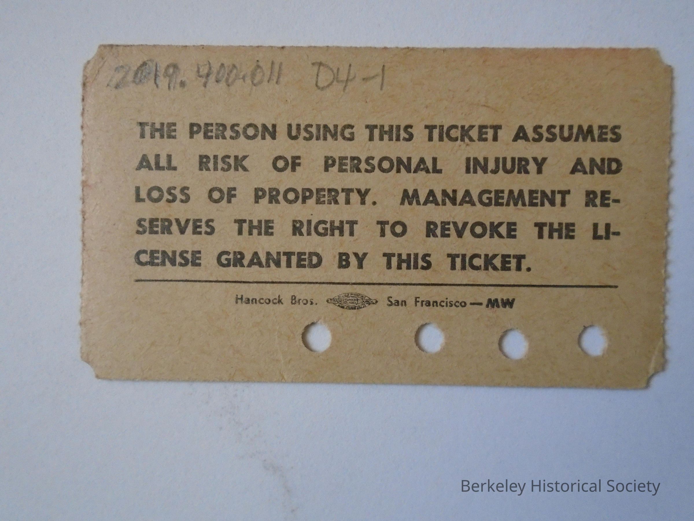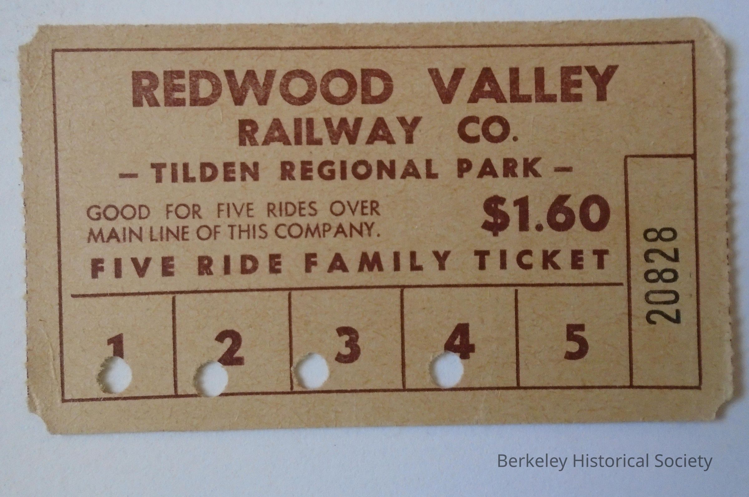Paper ticket for Redwood Valley Railway steam train in Tilden Regional Park. Five ride family ticket $1.60. 4 rides punched out.