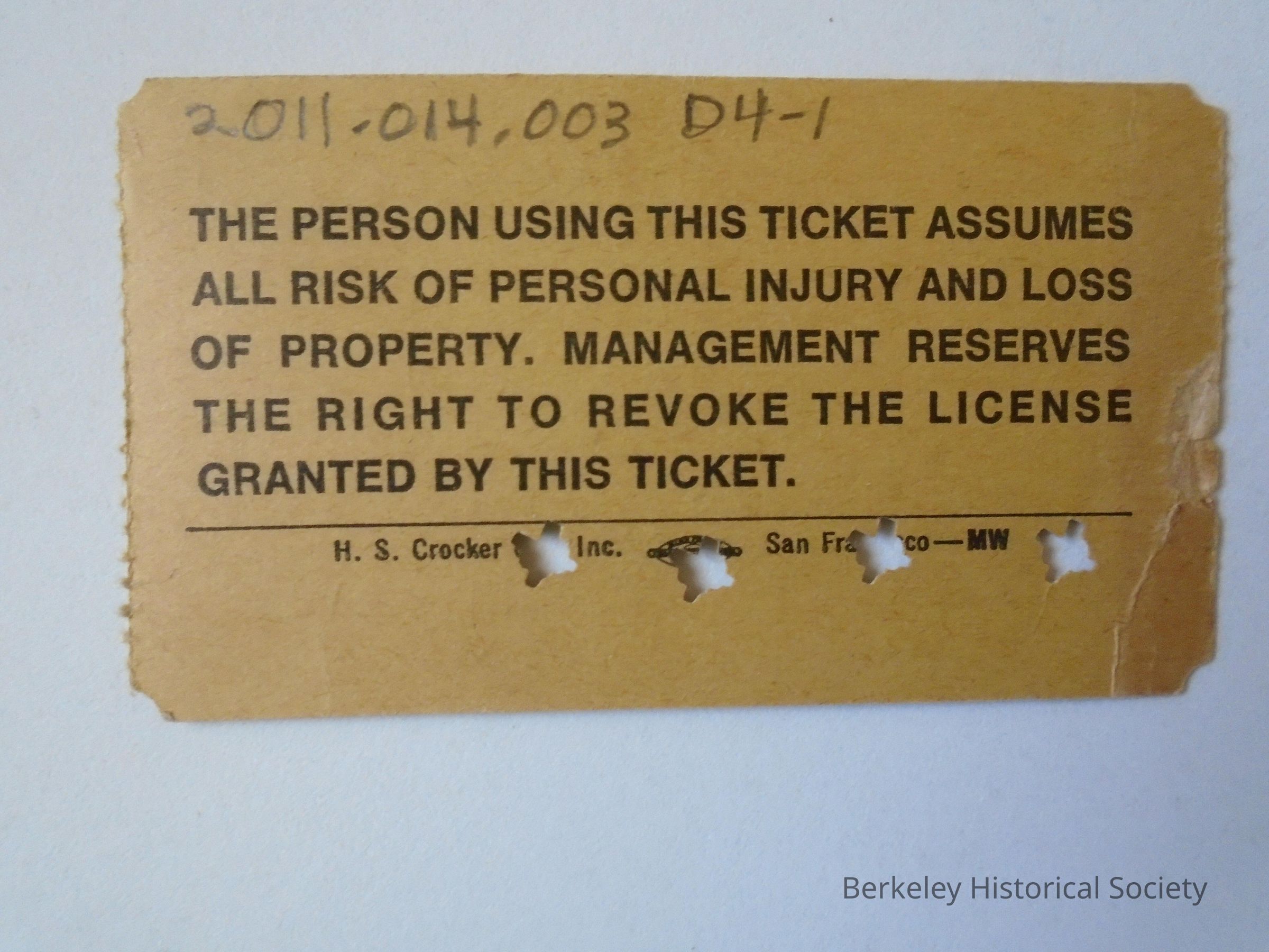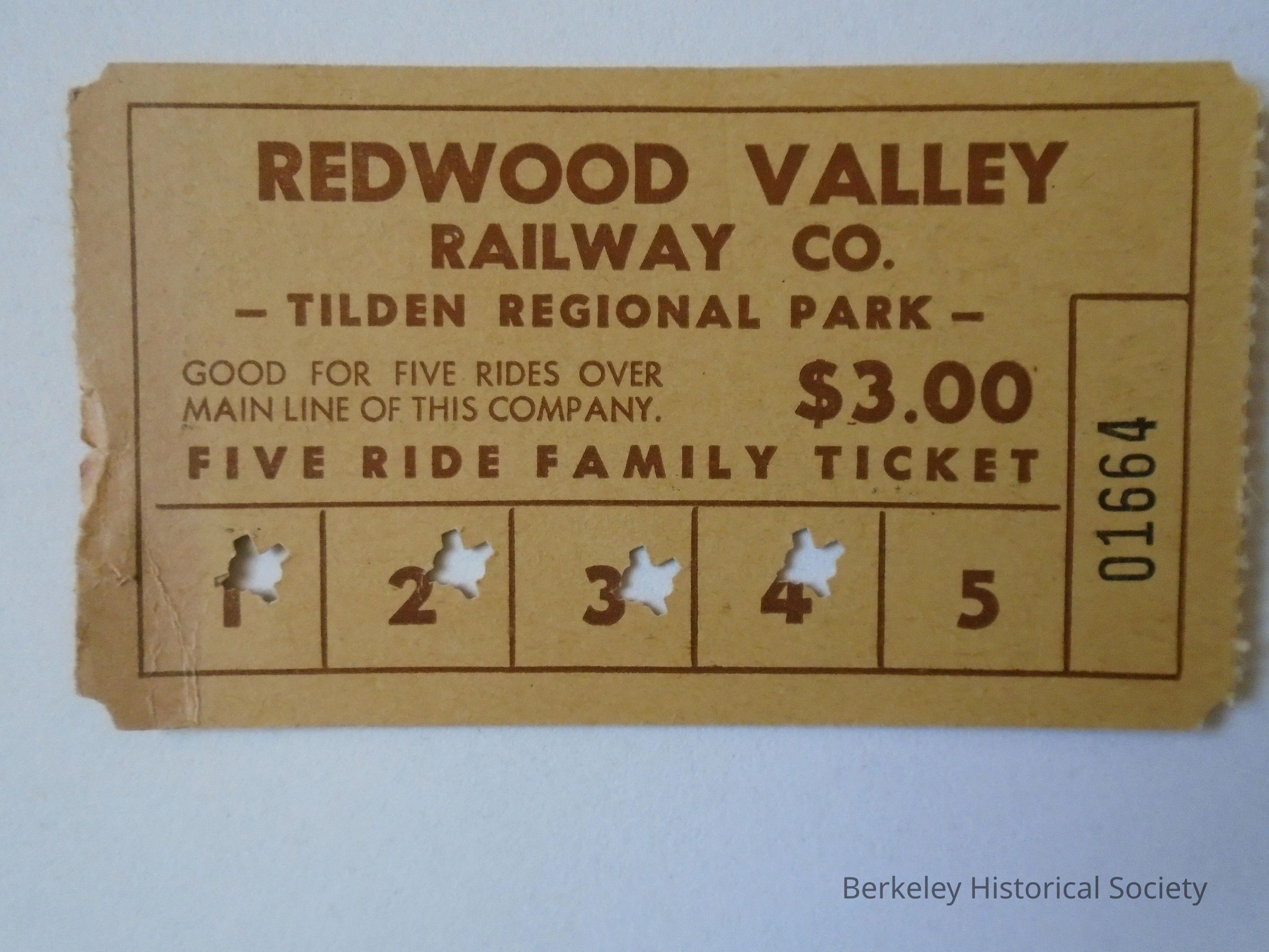 Paper ticket for Redwood Valley Railway steam train in Tilden Regional Park. Five ride family ticket $3.00. 4 rides punched out. # on ticket is 01664.