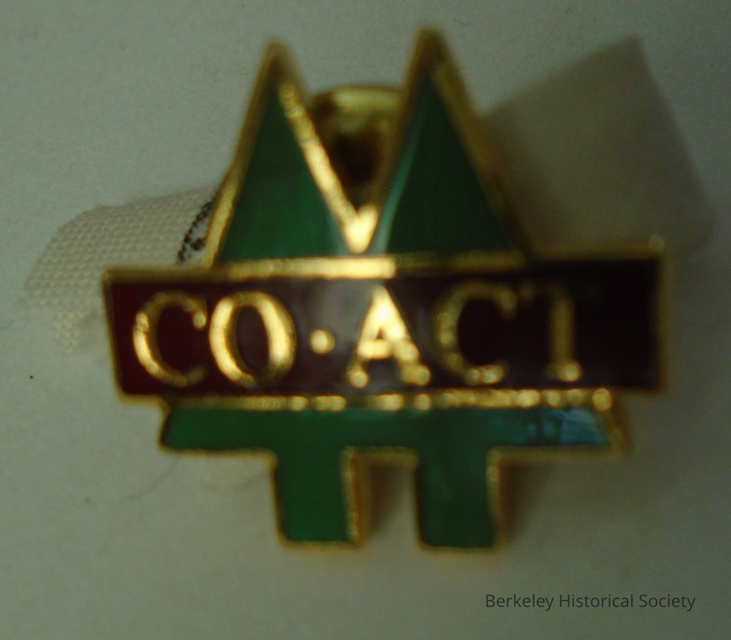 Metal tie tack with Co-op logo of 2 trees in green. Across center in red "CO-ACT".