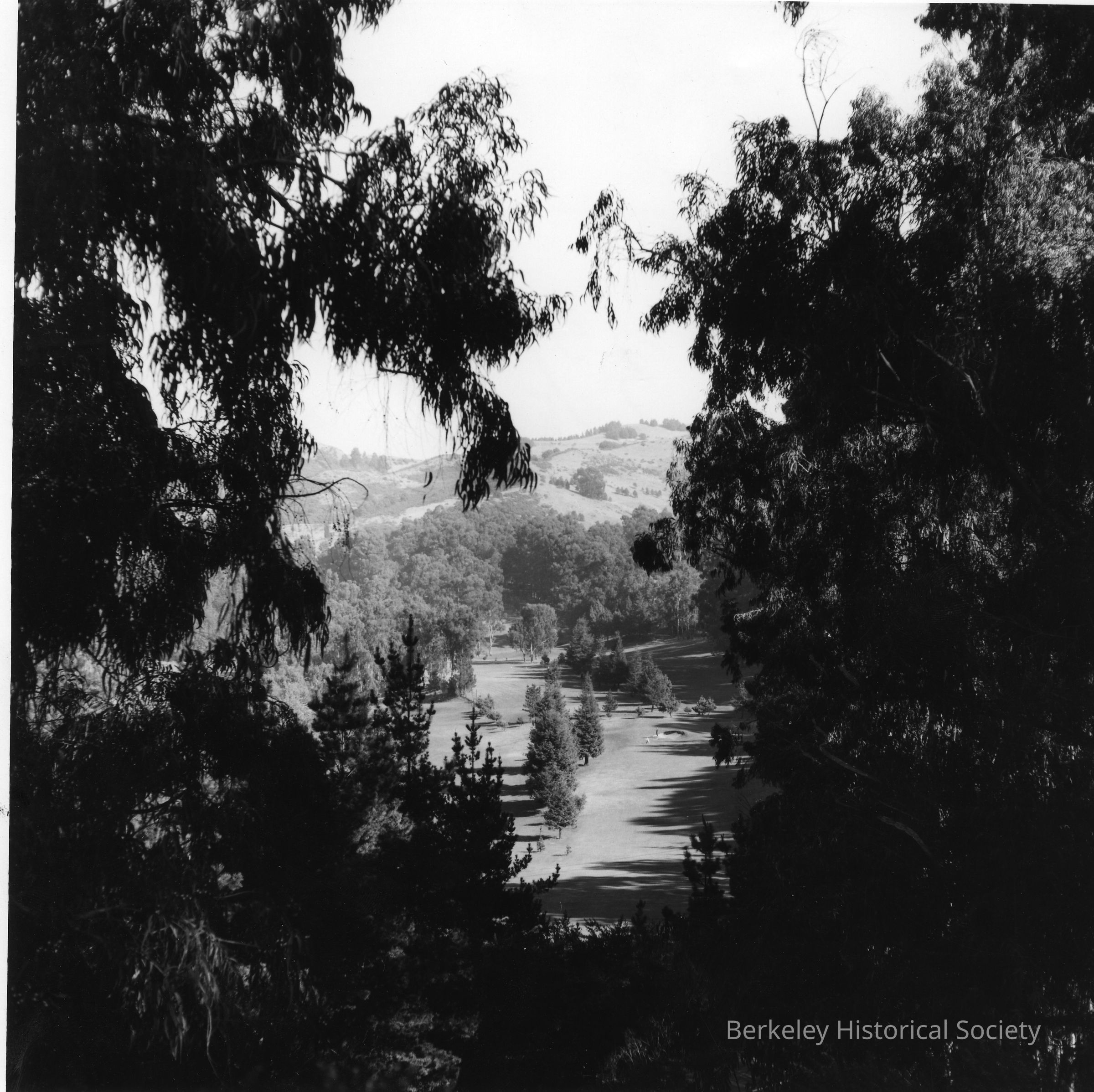 View between eucalyptus trees down to golf course.