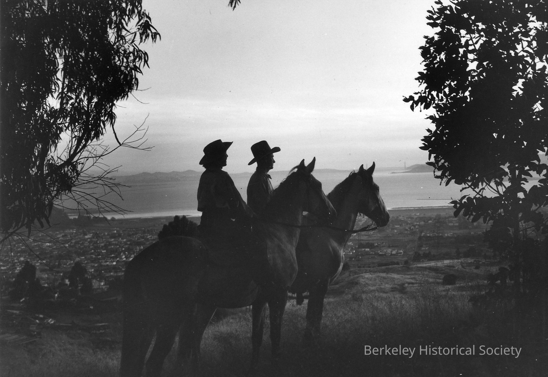 Two people on horseback, silhouetted against view to bay.Other Names and Numbers