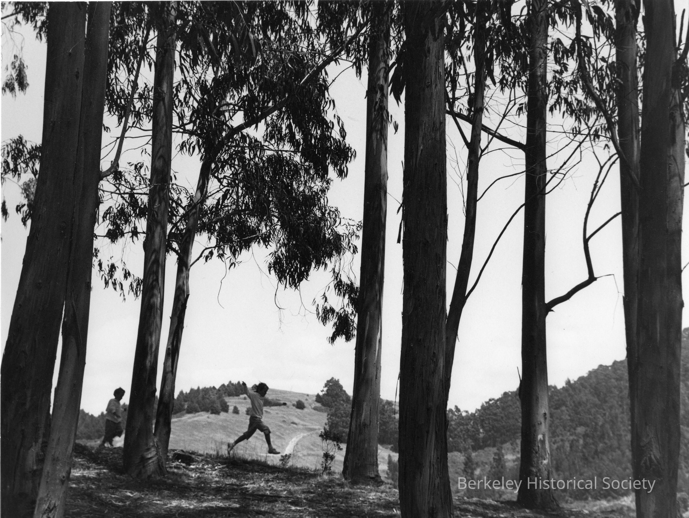 Child runnning just beyond group of eucalyptus trees.