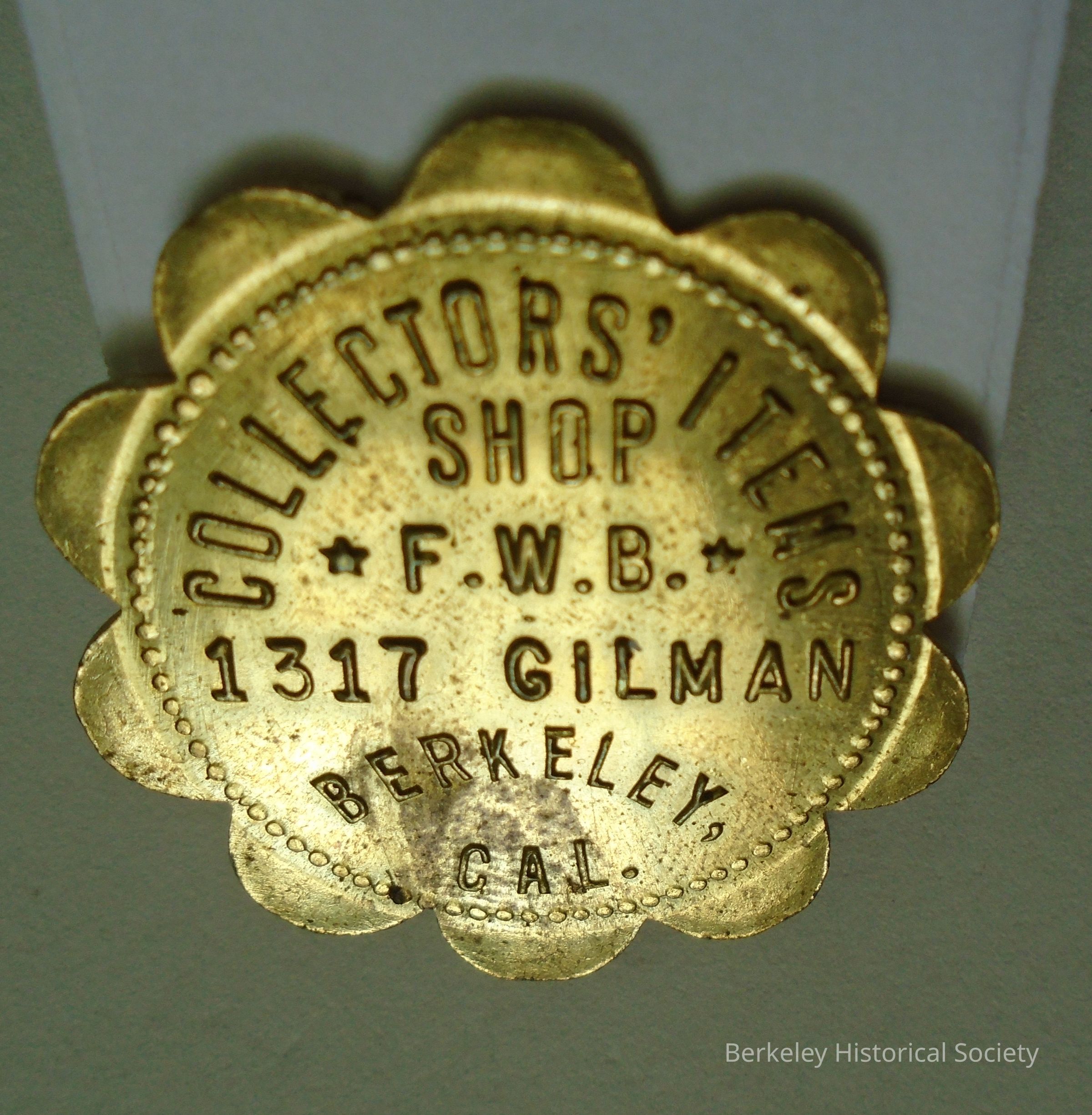 Brass token, one side reads: "GOOD FOR 30 CENTS IN TRADE". The other reads: Collectors' Items Shop, F.W.B., 1317 Gilman, Berkeley, CAL. Token is round with scalloped edge.Made/Created