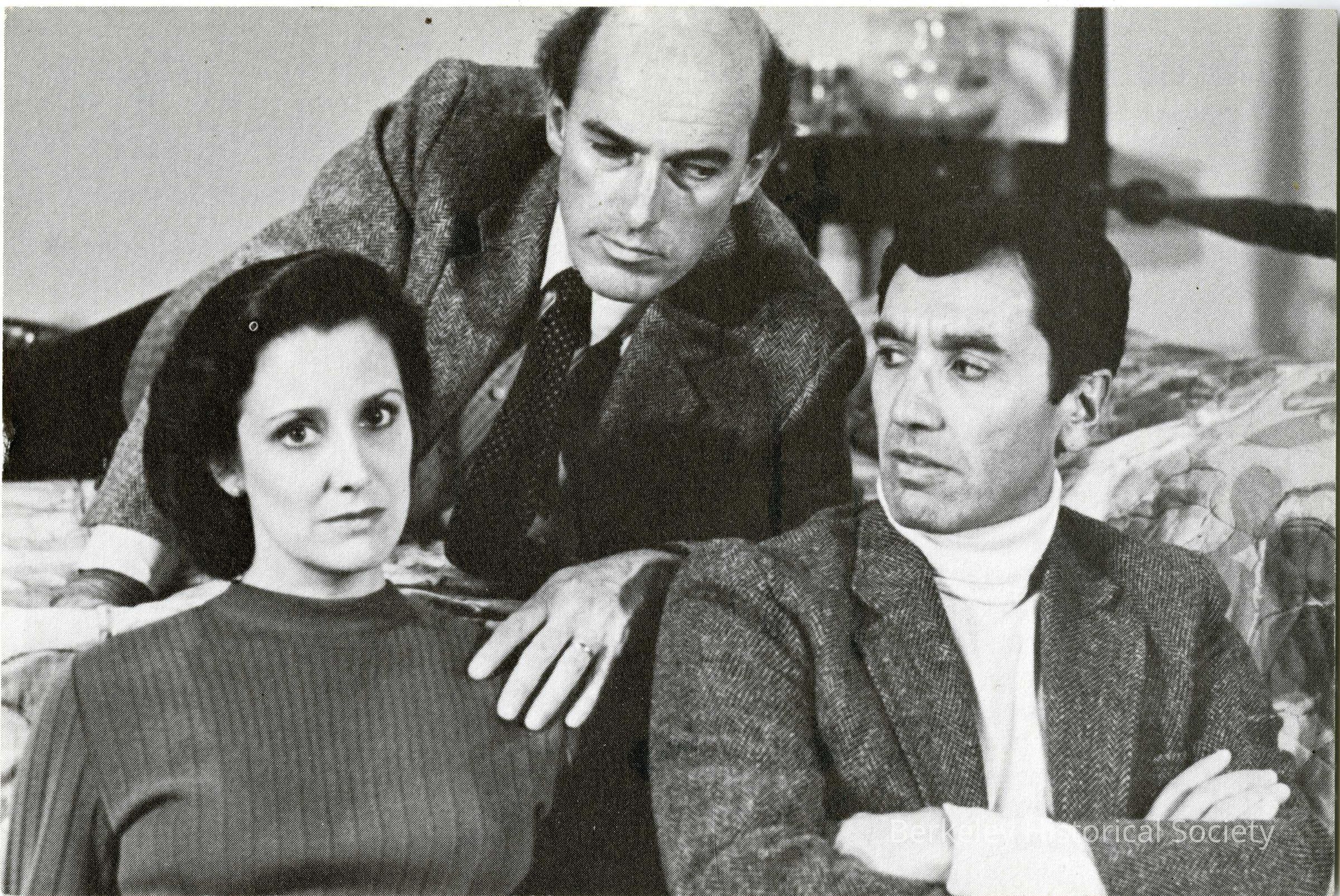 Postcard advertising a Tour de Force/Addison Stage Co. production of Harold Pinter's Betrayal. Postcard features a photograph of of the production with actors Nancy Palmer Jones, Ric Prindle, and Terry Lamb. No message present. 1111 Addison Street.