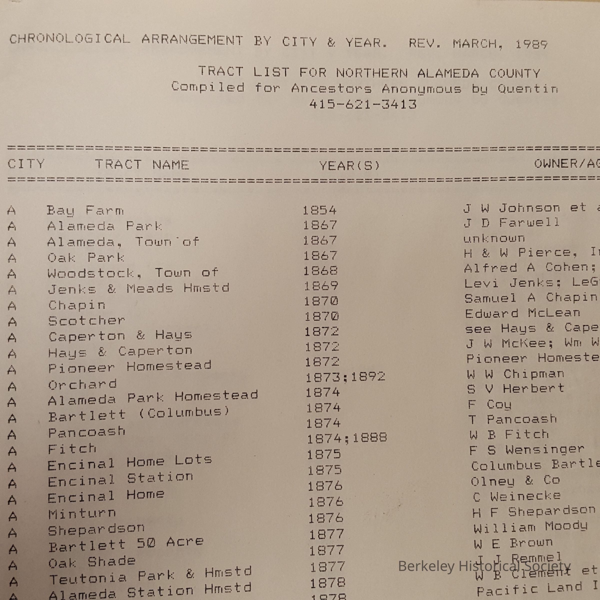 Tract list for northern Alameda County, chronological arrangementEntry/Object ID