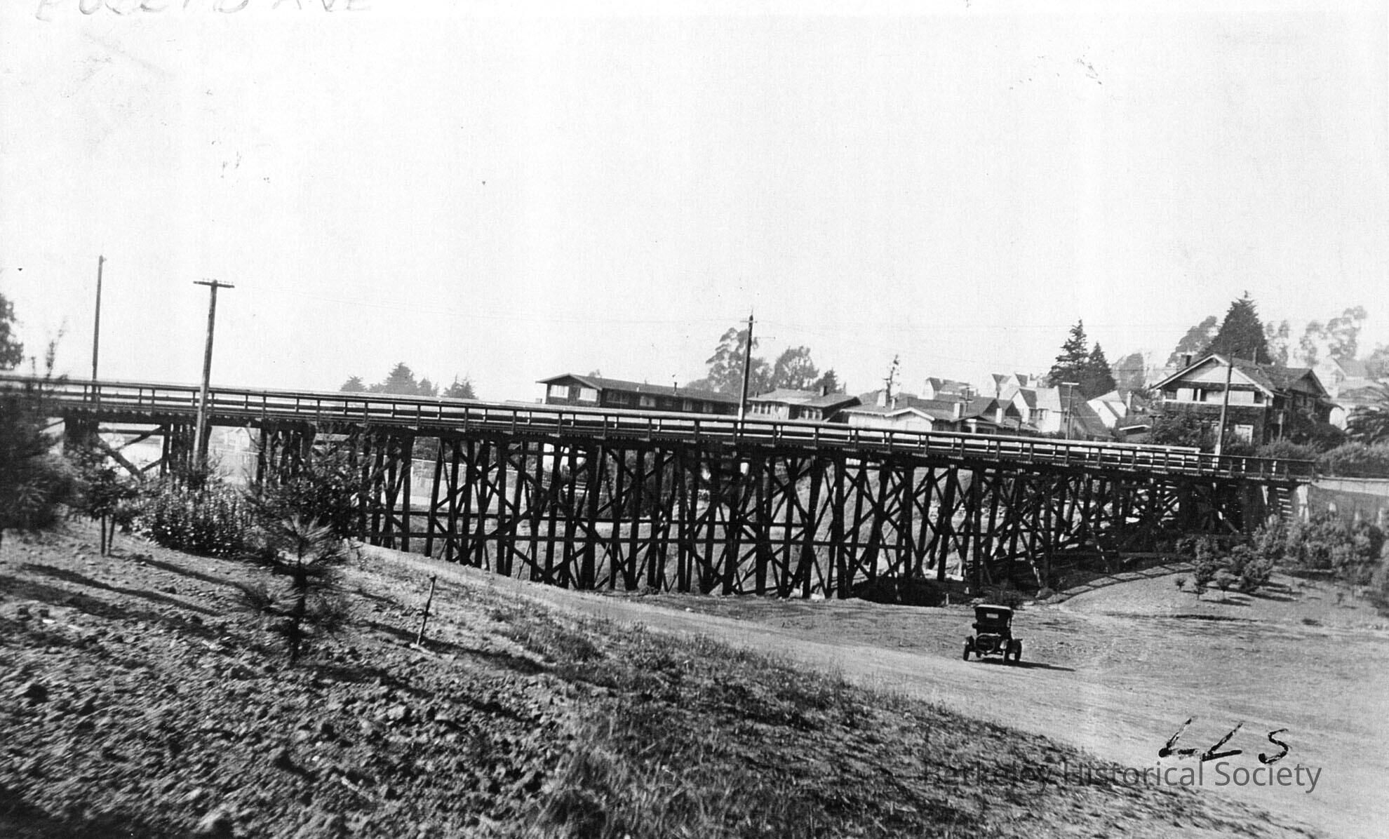 Houses in background; car near base of trestle.Made/Created