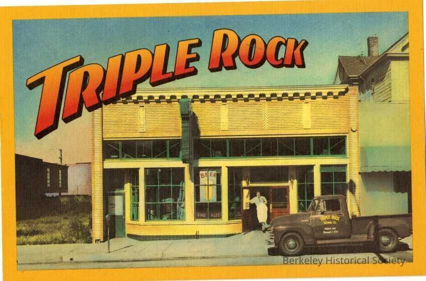 Postcard featuring color photo of Triple Rock Brewery on 1920 Shattuck Avenue. Postcard design and photo tinting by Barbara Flores Design. The brewery opened in1986.