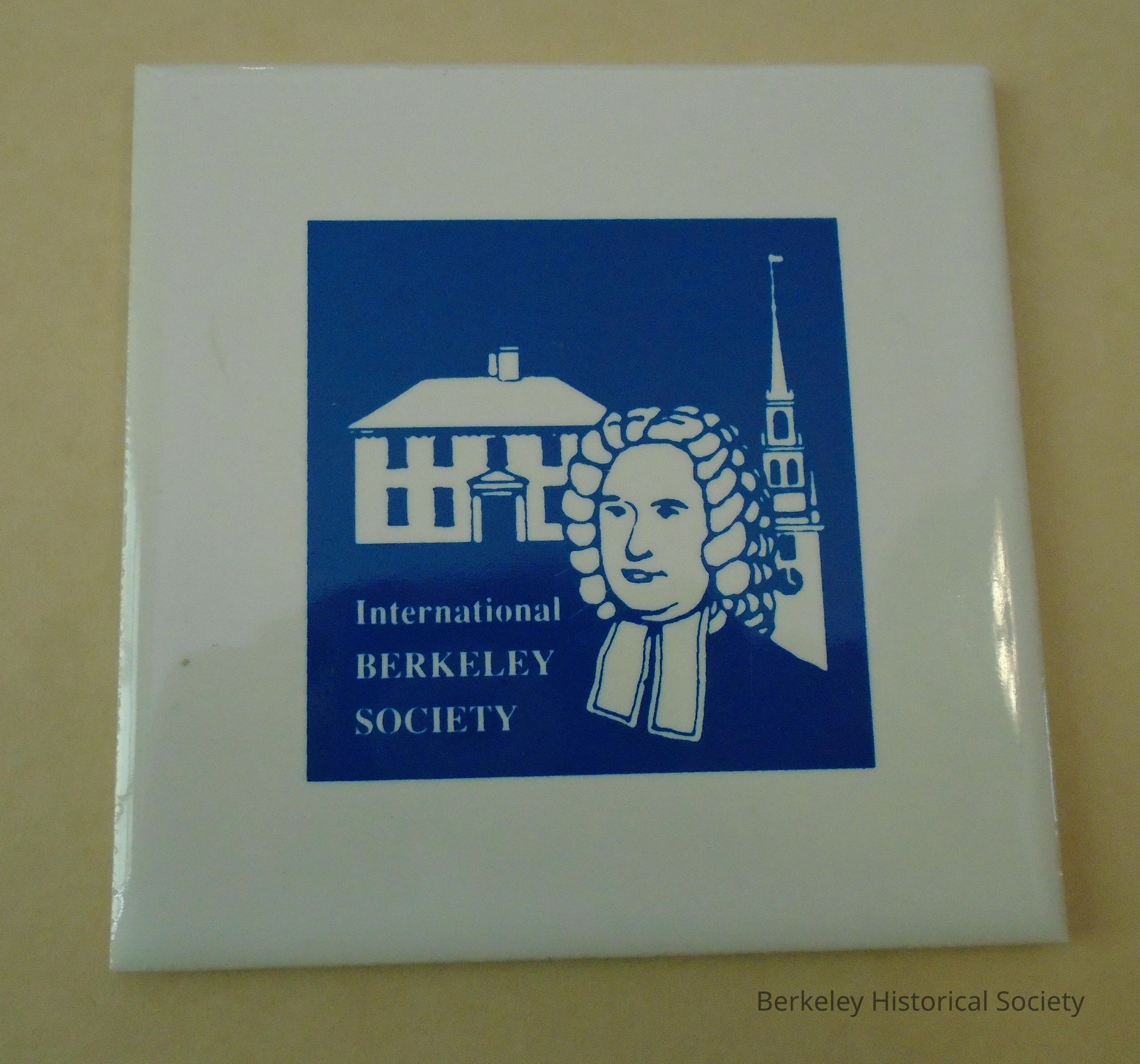 White tile trivet with blue square inset and white lettering. Reads "International BERKELEY SOCIETY" and shows an outline in white of Bishop Berkeley, house and campanile.