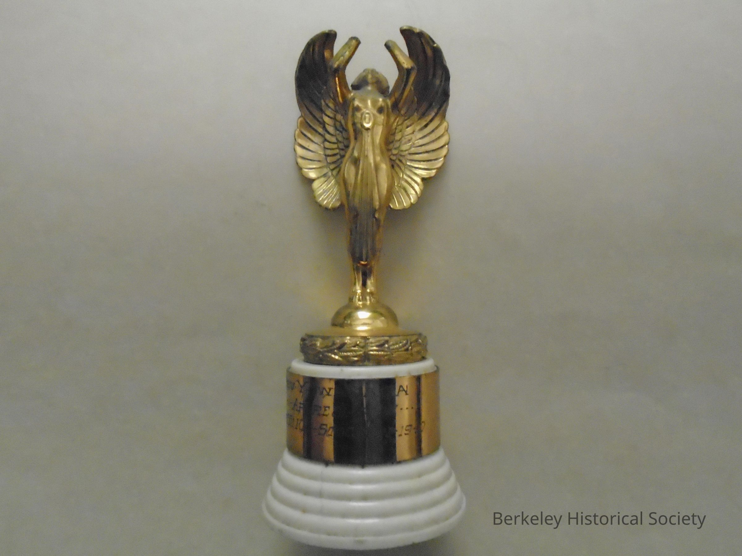 Trophy with gold-painted figure on creamplastic base. Figure is of a woman with wings, face up and hands stretched toward sky. Base is stepped pedestal with brass band completely around center. Engraved "Rev. Y. Iwanaga, Appreciation , Shoya Kai Stockton 1940".
