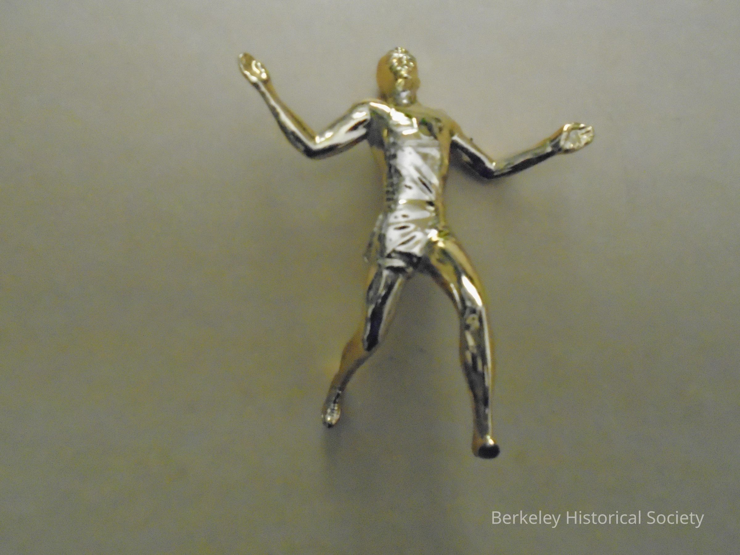 Broken Track and Field Trophy figure. Runner from trophy 1978.002.107. Metal figure painted gold, of a runner in tank top and shorts with arms and legs spread wide.