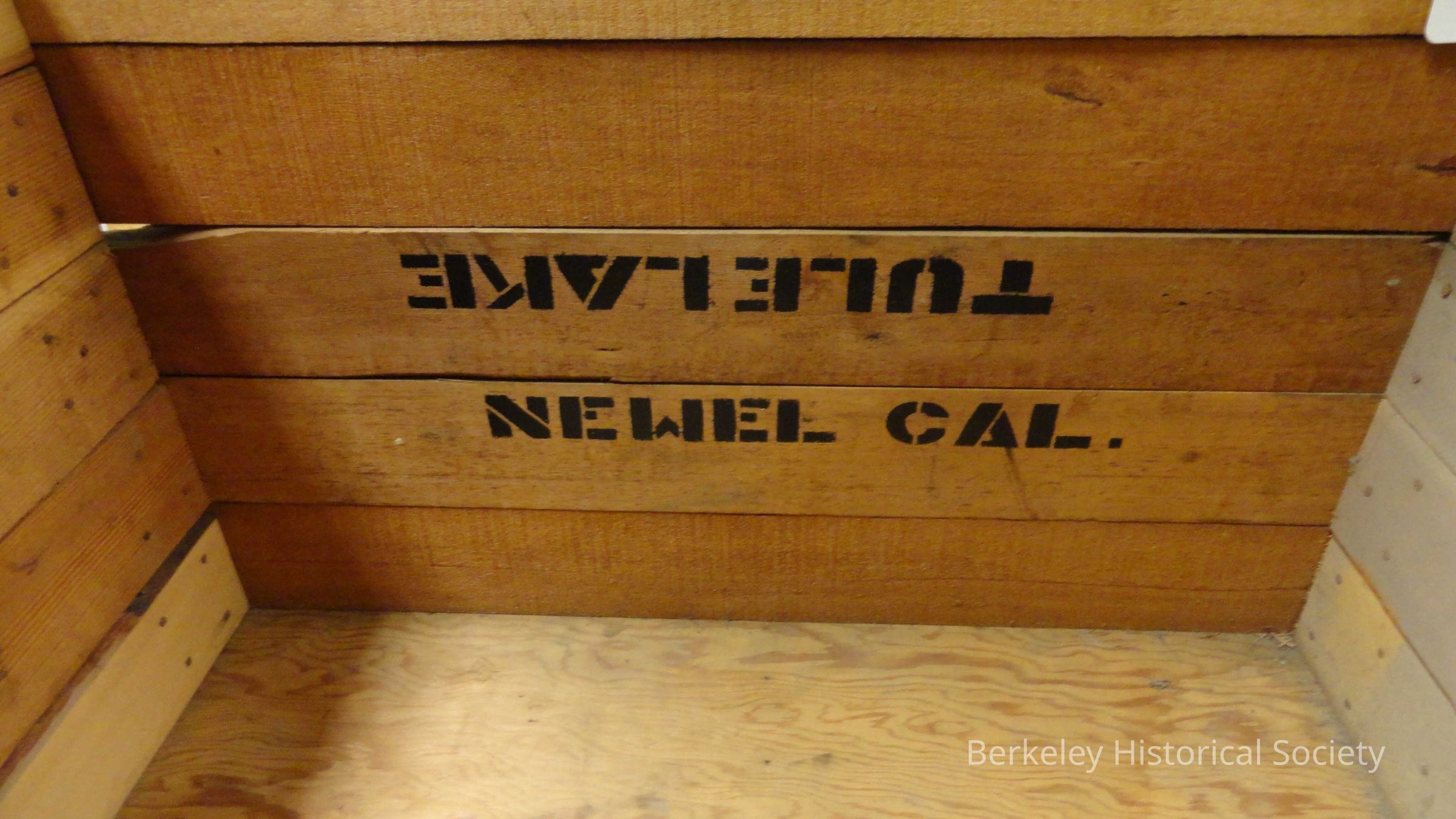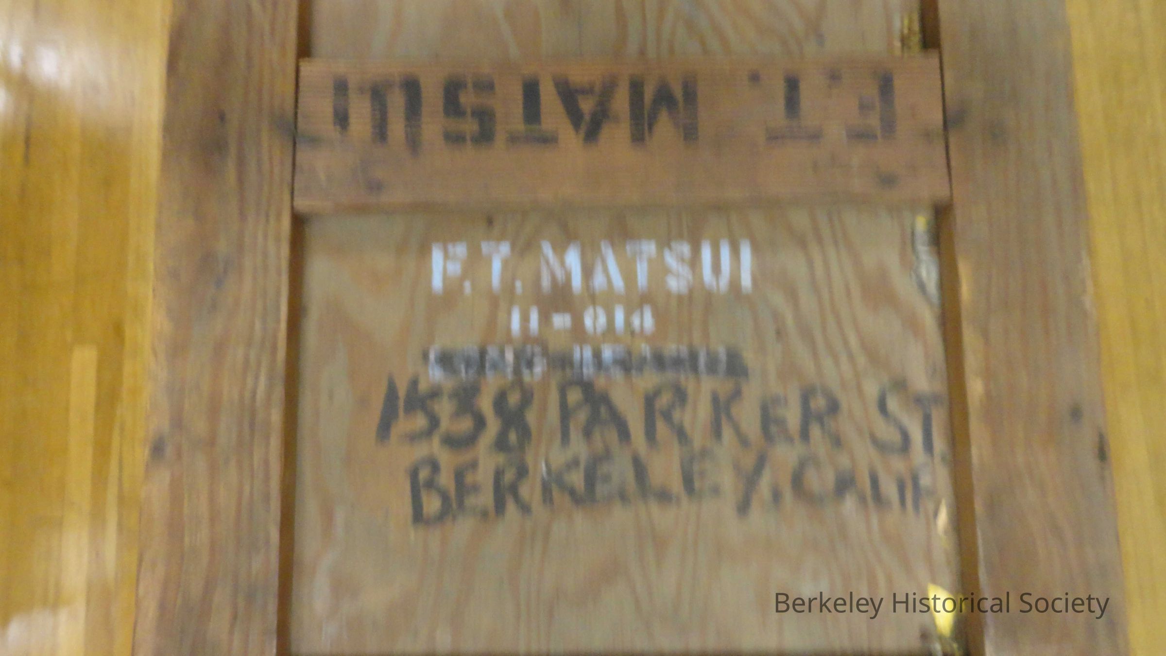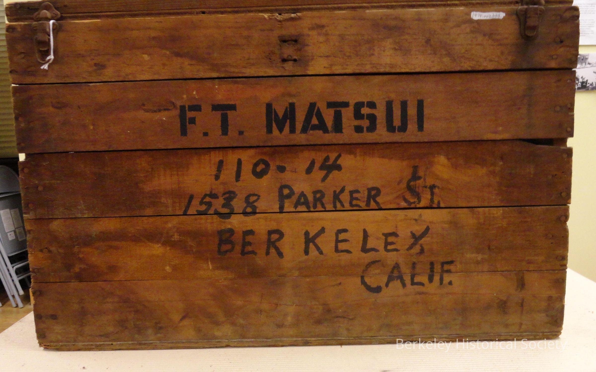 Rectangular, sturdy dark wood trunk. Trunk is nailed together and has metal hinges. Written in black on front: F. T. Matsui, Family 110-14, 1538 Parker St., Berkeley Calif. On back: F.T. Matsui, Central Utah. (Also may have a small piece of paper stapled on one end, typewritten: "Frank Matsui, Family No. 11-014, Central Utah, War Relocation Authority". Can't access to see, but this label was on trunk #1 and they appear to be identical....see 1978.002.333). Used by Frank Matsui and family when they (Japanese) were sent to detention camps during WWII. He originally assembled in Santa Anita (southern Calif.) and was sent to Tule Lake 10/29/42. The family was relocated to Utah/Topaz in 9/28/43. Frank was released in 5/1/44 to work nearby while his family stayed at Topaz. In 1945 they were able to leave and moved to Berkeley.Lexicon
