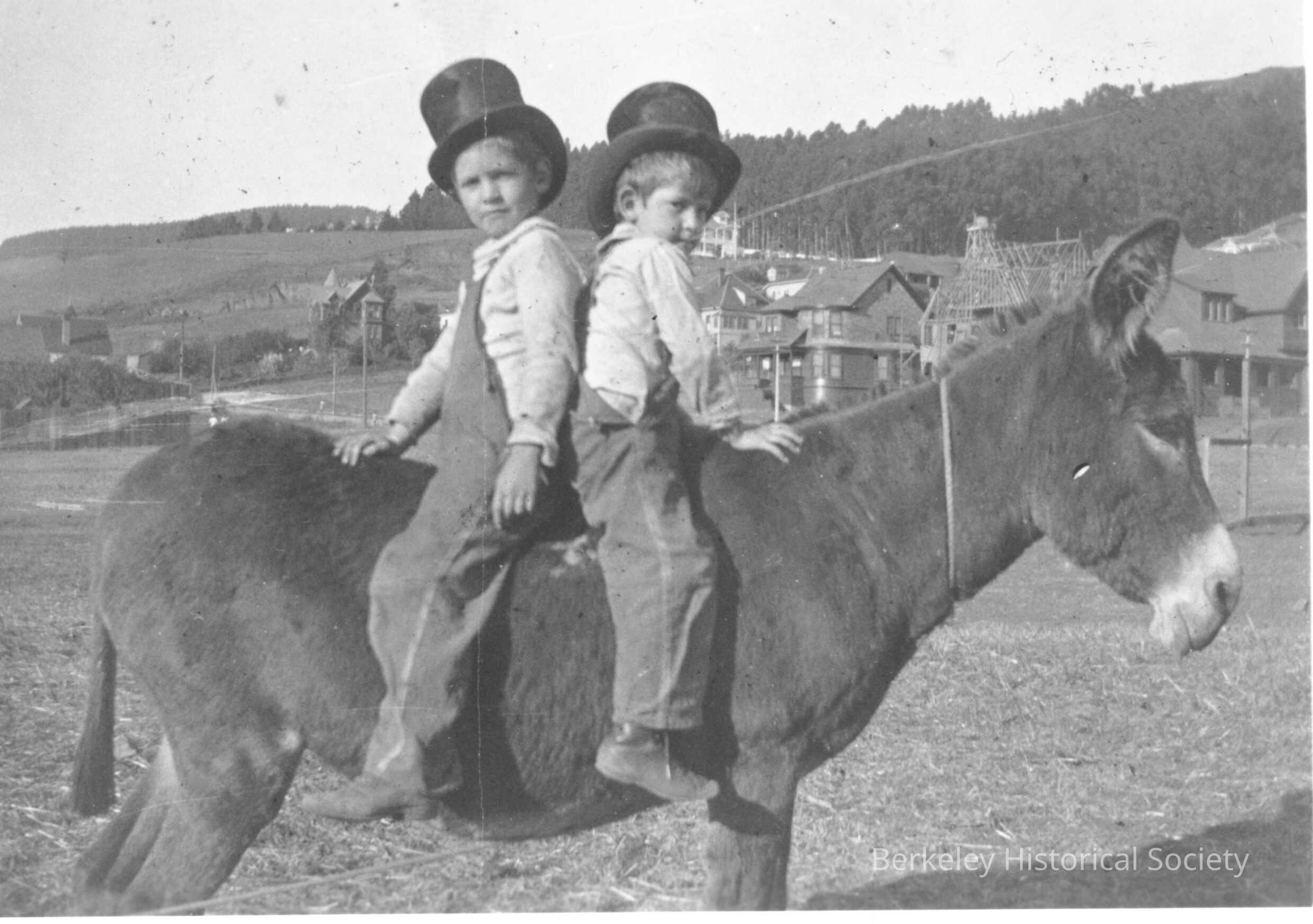 Two young boys sit back to back on a donkey. The boys are wearing overalls and top hats.