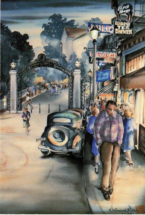 Undivided postcard featuring reproduction of watercolor painting of Sather Gate, street signs, and people by Chiura Obata. No message present.