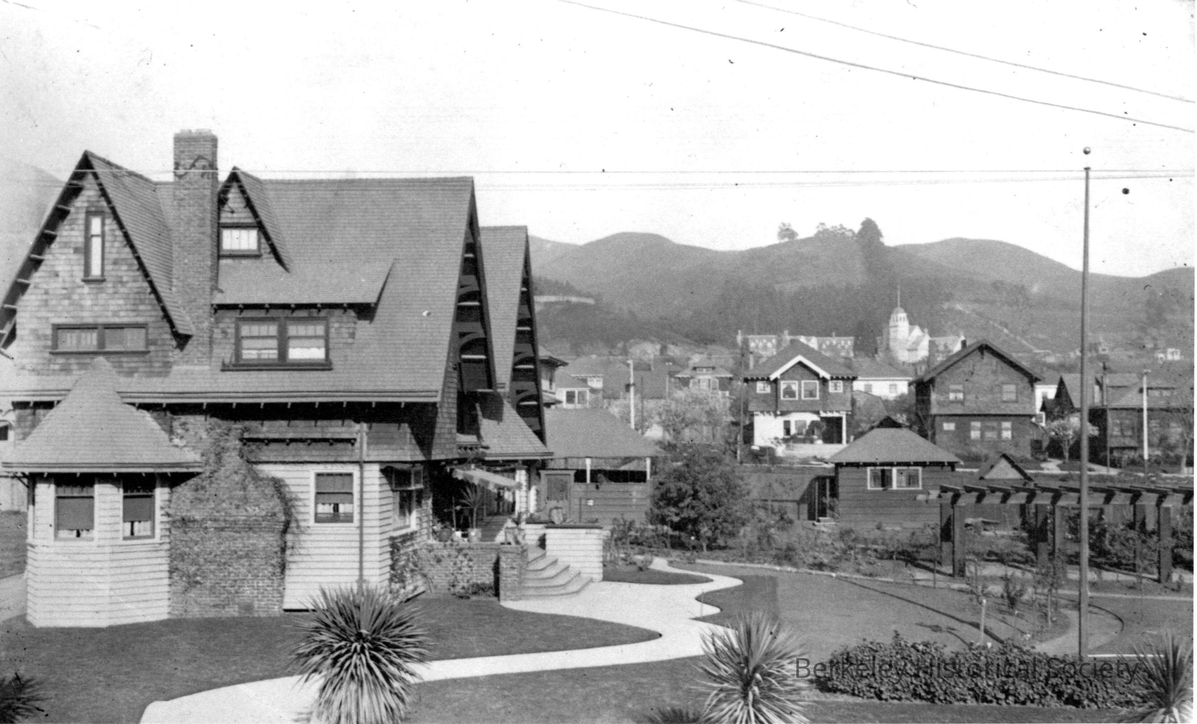 House with large property, curved path leading to entrance; pergola to the right. In background are other houses and in distance is the Claremont Hotel.Other Names and Numbers
