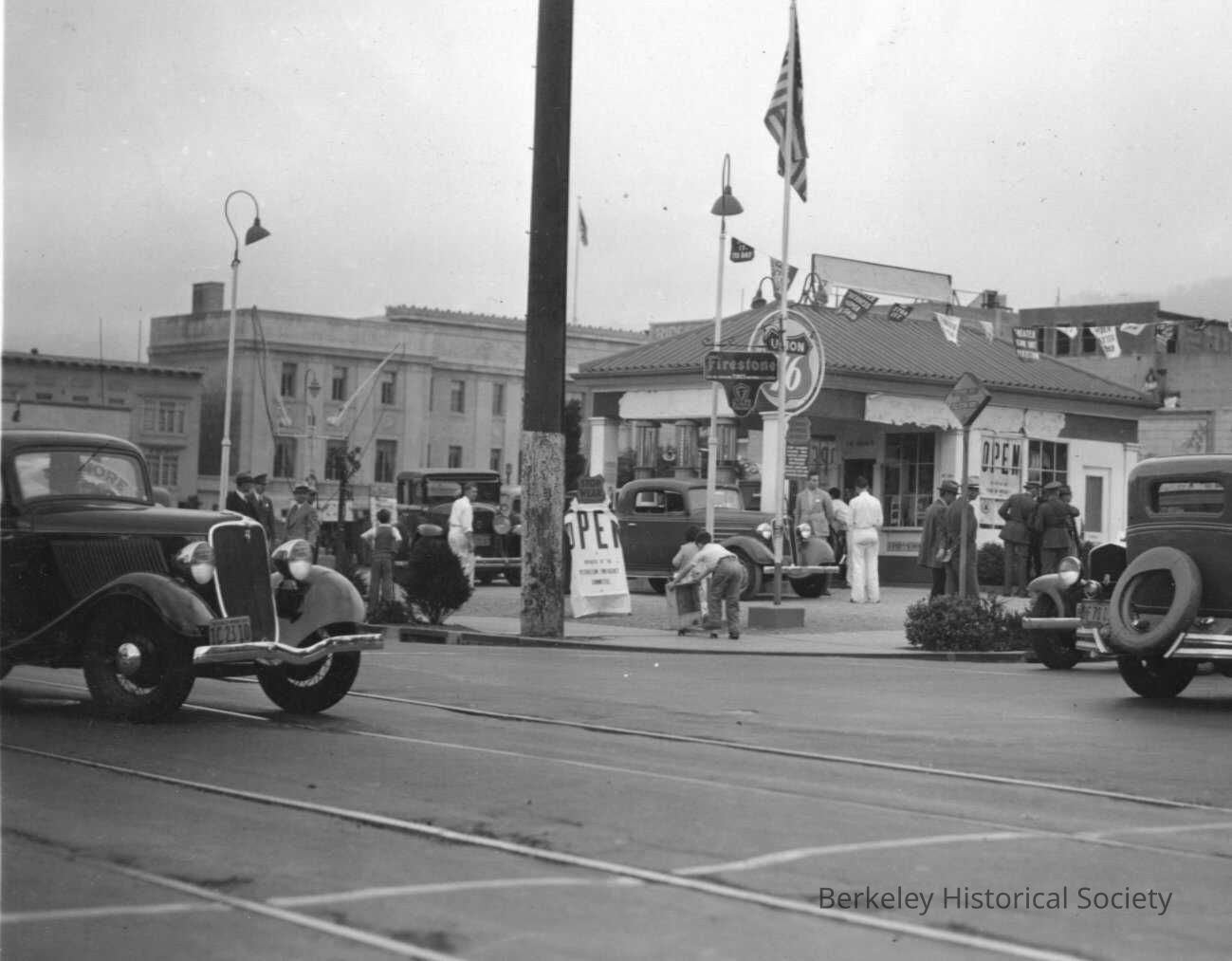 Union 76 Service Station on opening day at Grove and Allston Way. Veterans' Building in the background. Northeast corner of Grove Street and Allston Way.