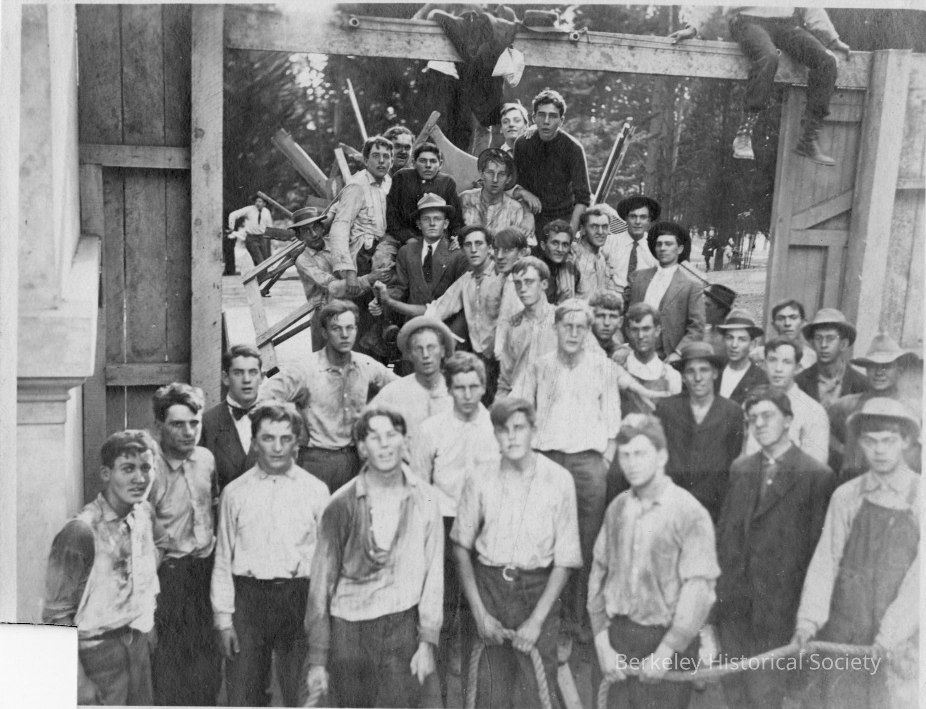 Gathering wood for bonfire; group of students entering a gate with wagon of wood for bonfire.