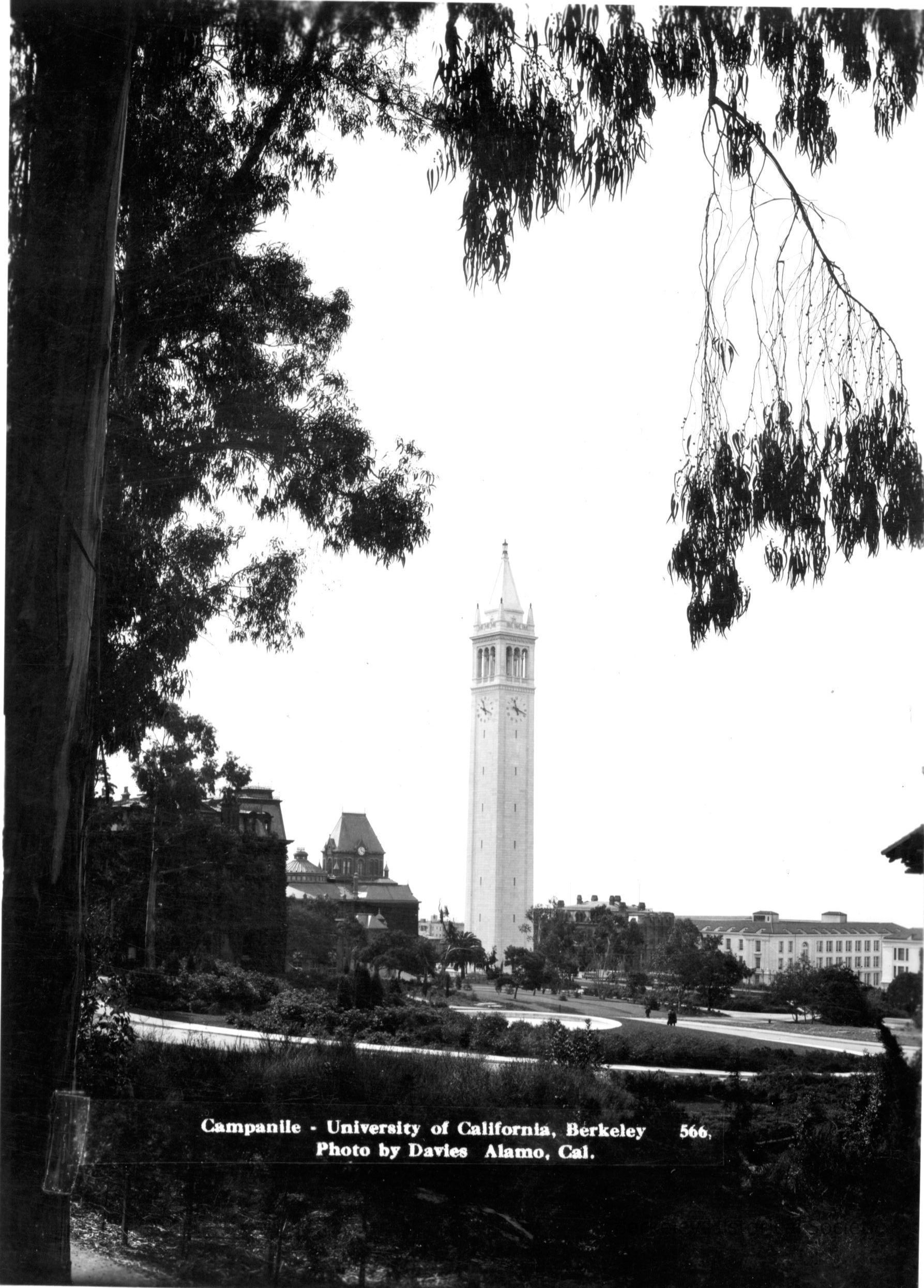 Campanile seen through trees, looking to southwest. Bacon Hall and Wheeler Hall visible.