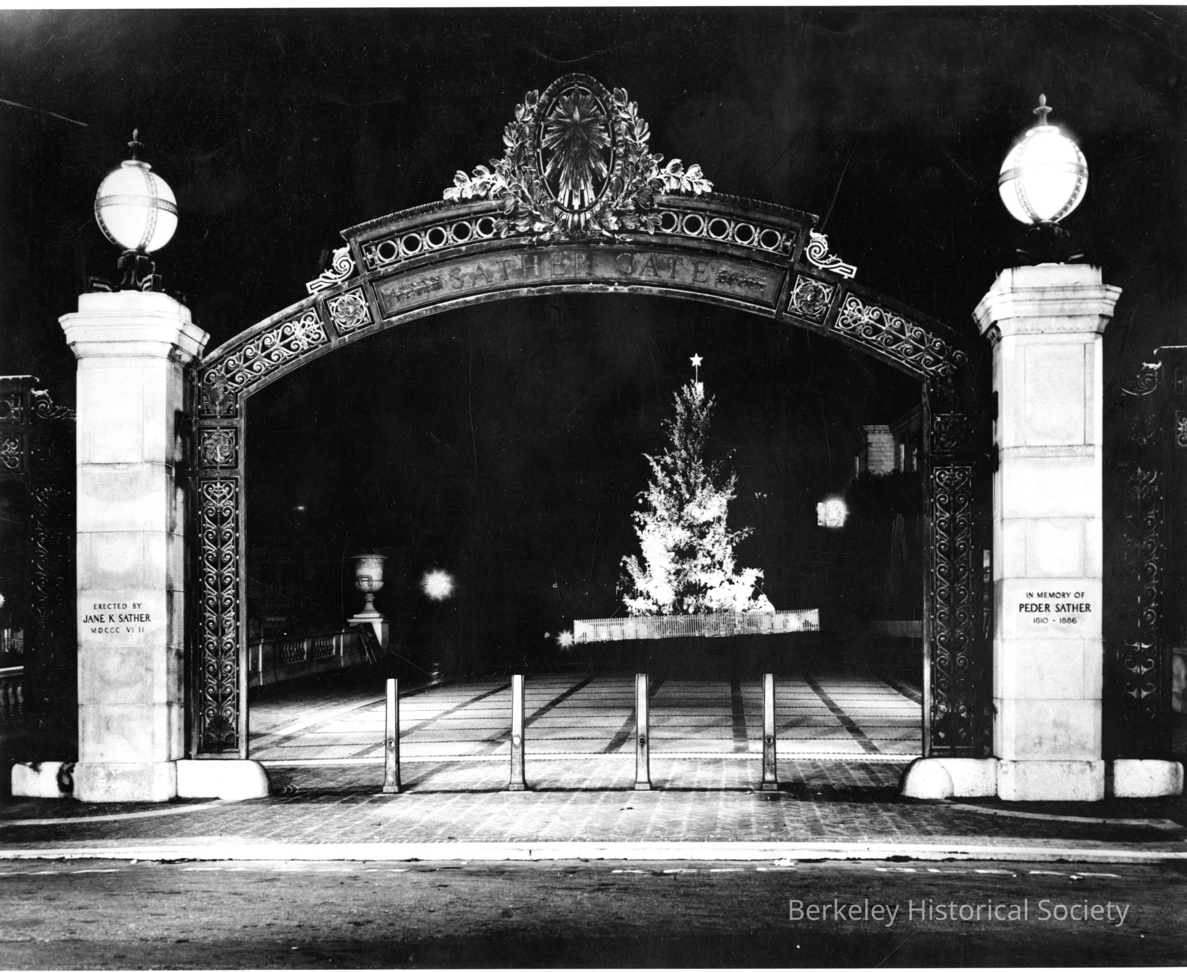 Christmas tree seen through Sather Gate.