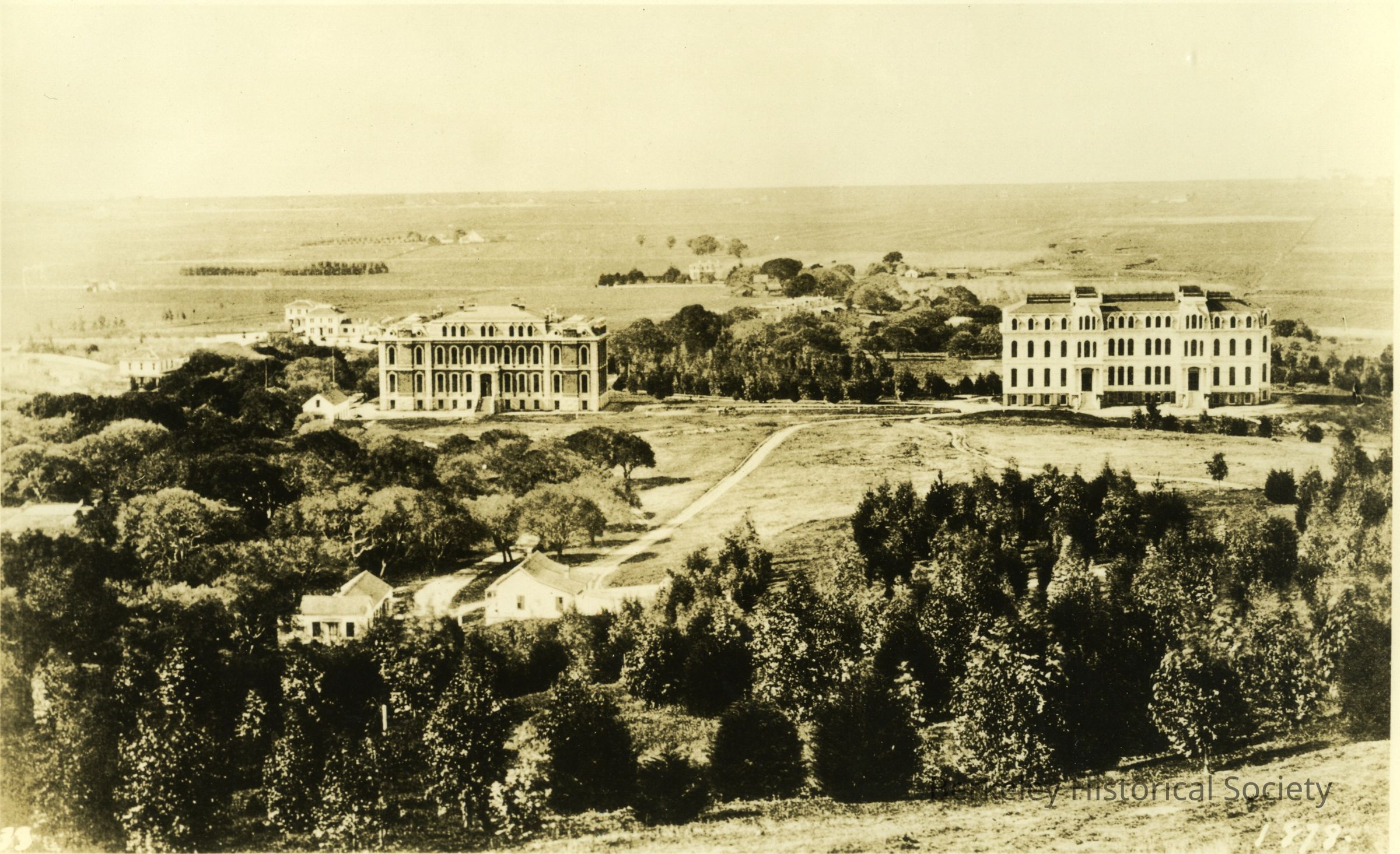 View from hills westward over university grounds with South Hall and North Hall; empty land beyond.