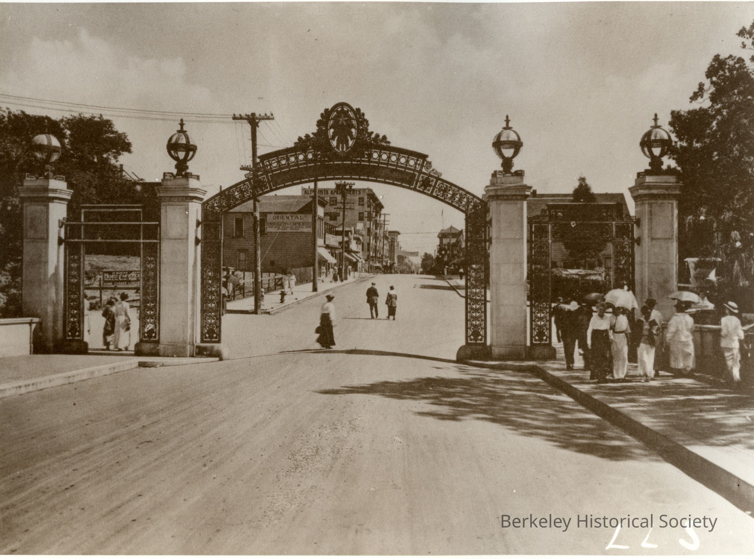 View through Sather Gate looking south to Telegraph Ave.. Female students walking to Telegraph. .not complete; east side not finished. Gate completed in 1910