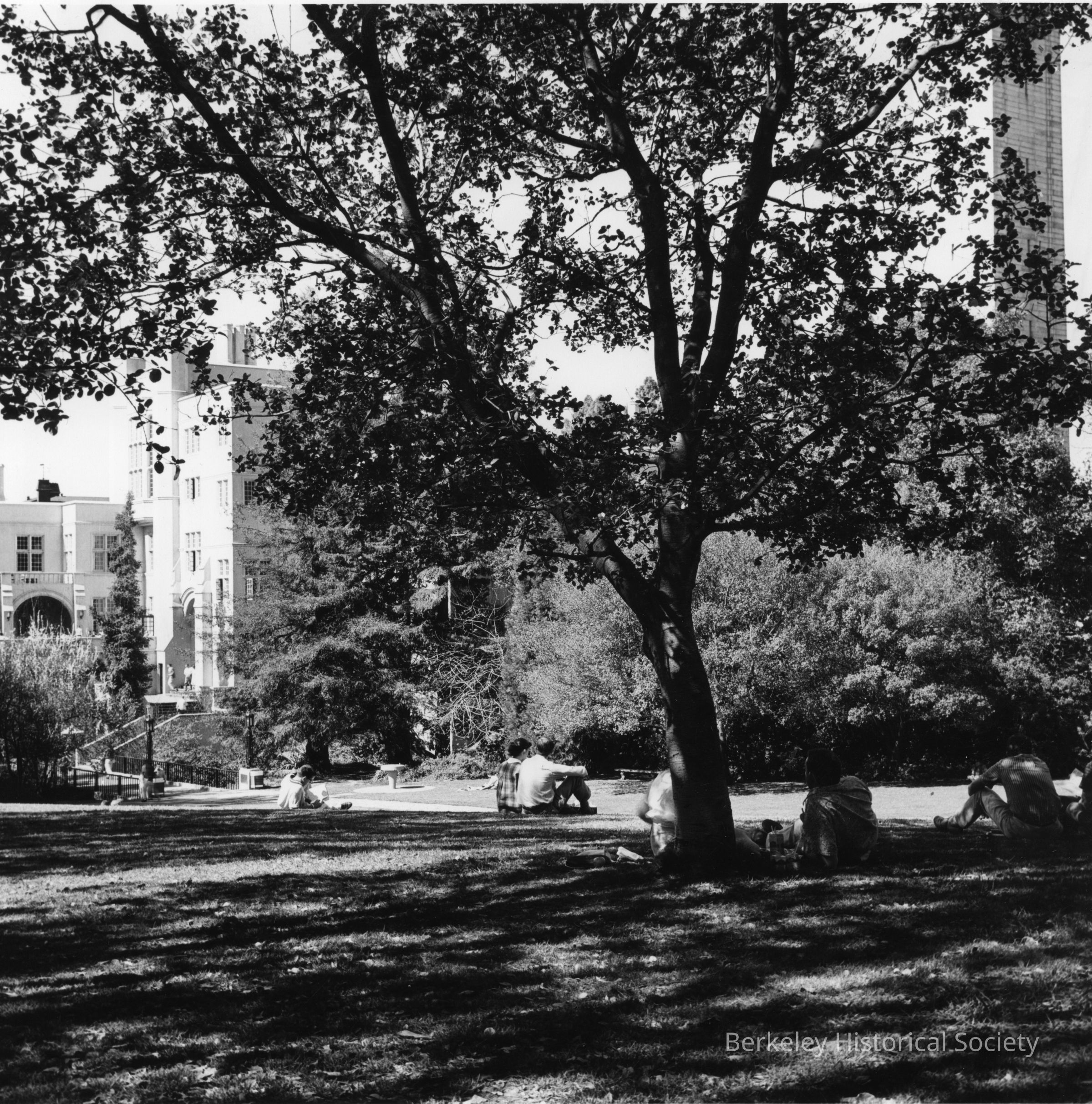 View from top of Faculty Glade; Stephens Hall and Campanile visible through trees. Students on grass.