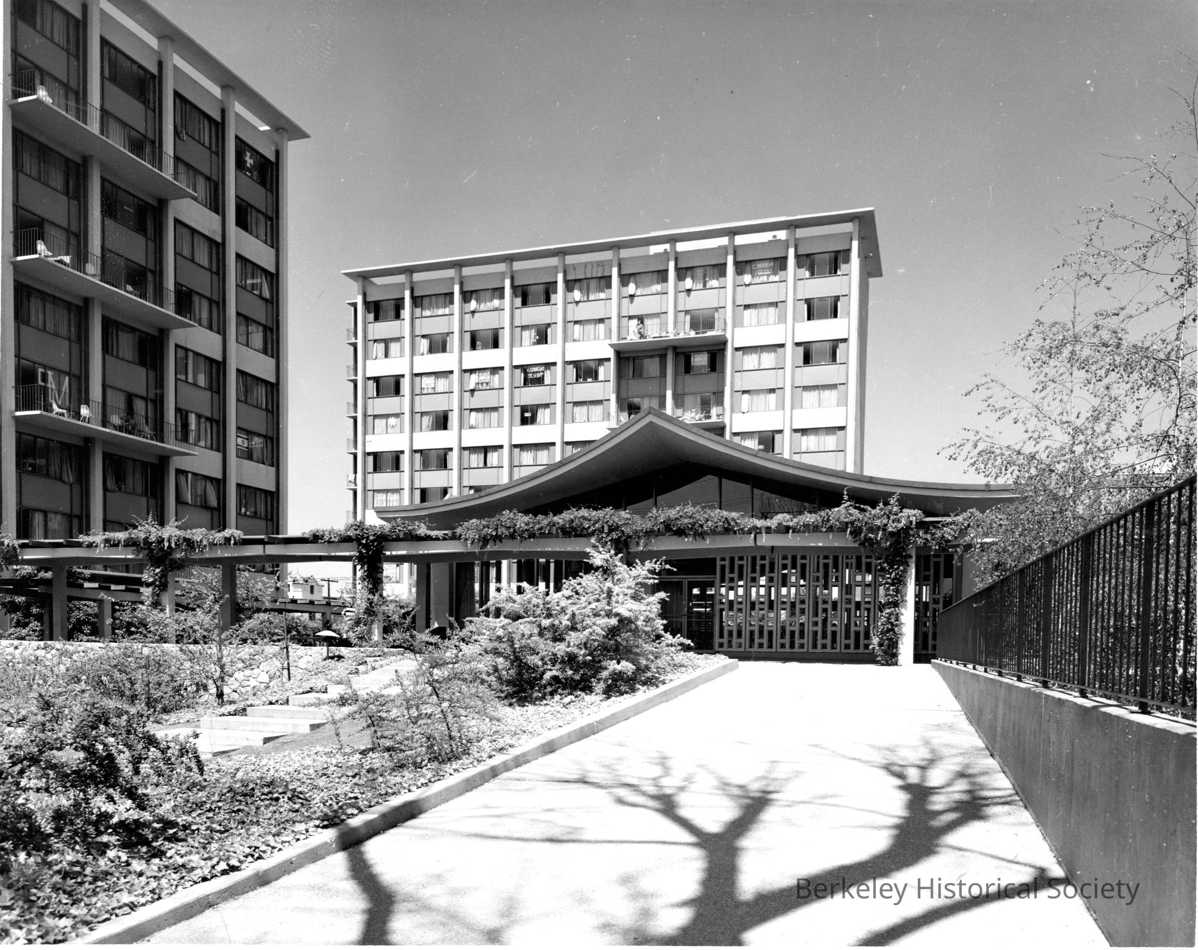 Student dormitory buildings seen across the central plaza. Durant Avenue.