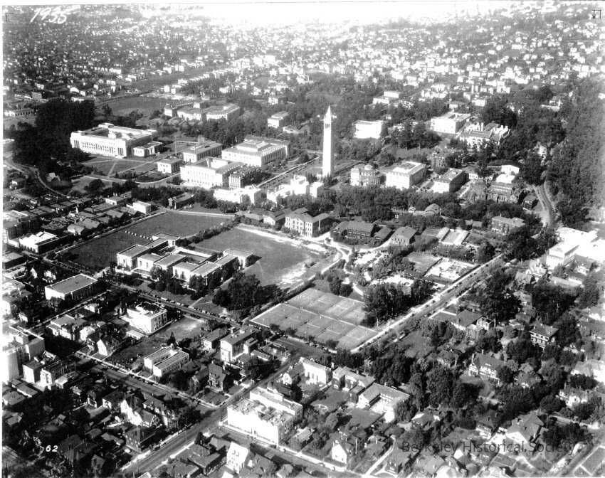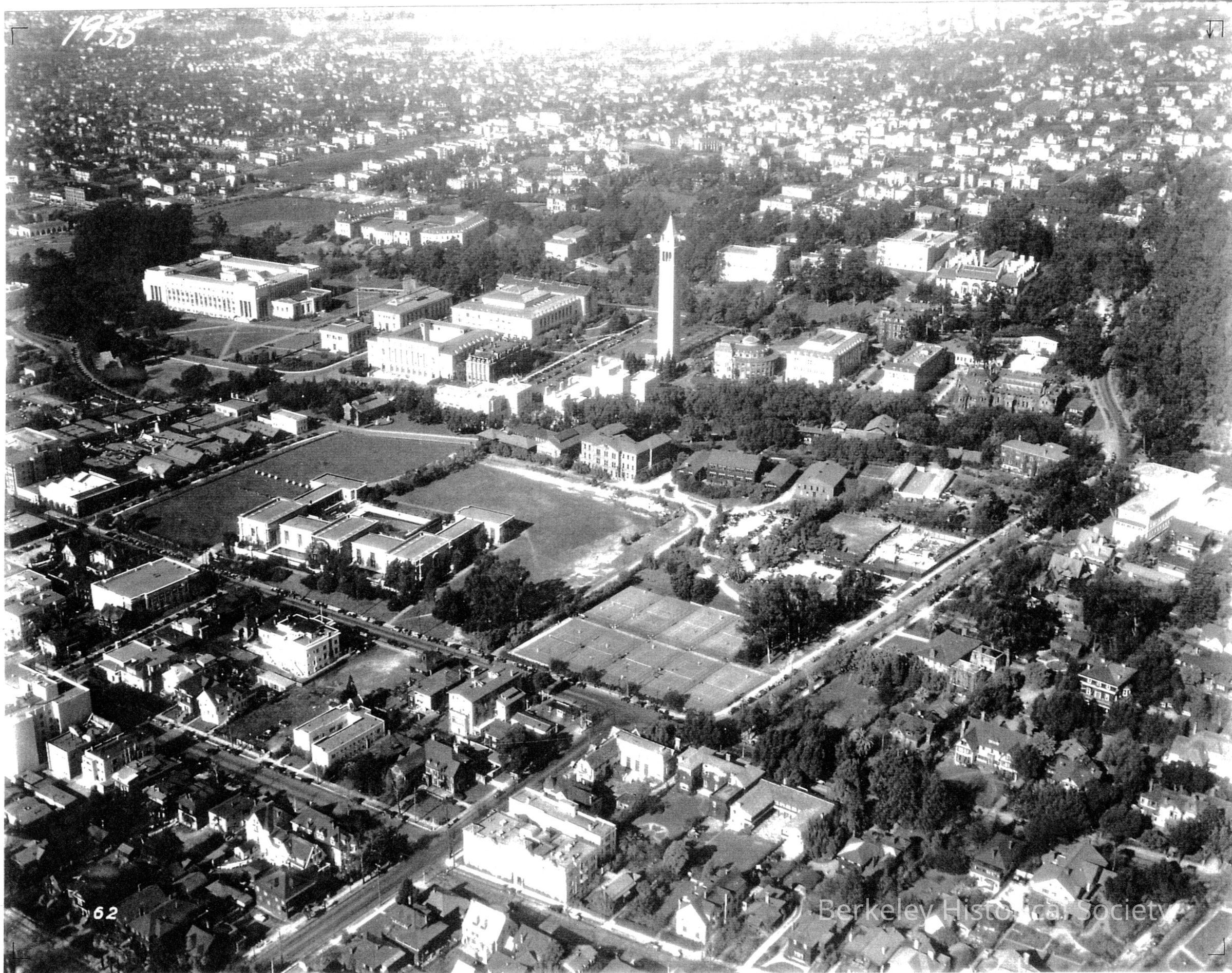 Sather Tower, Doe, Life Science, Hearst Avenue, Bancroft Way, College Avenue, Durant Hotel, Telegraph Avenue, Bacon Hall, South Hall, Landscape