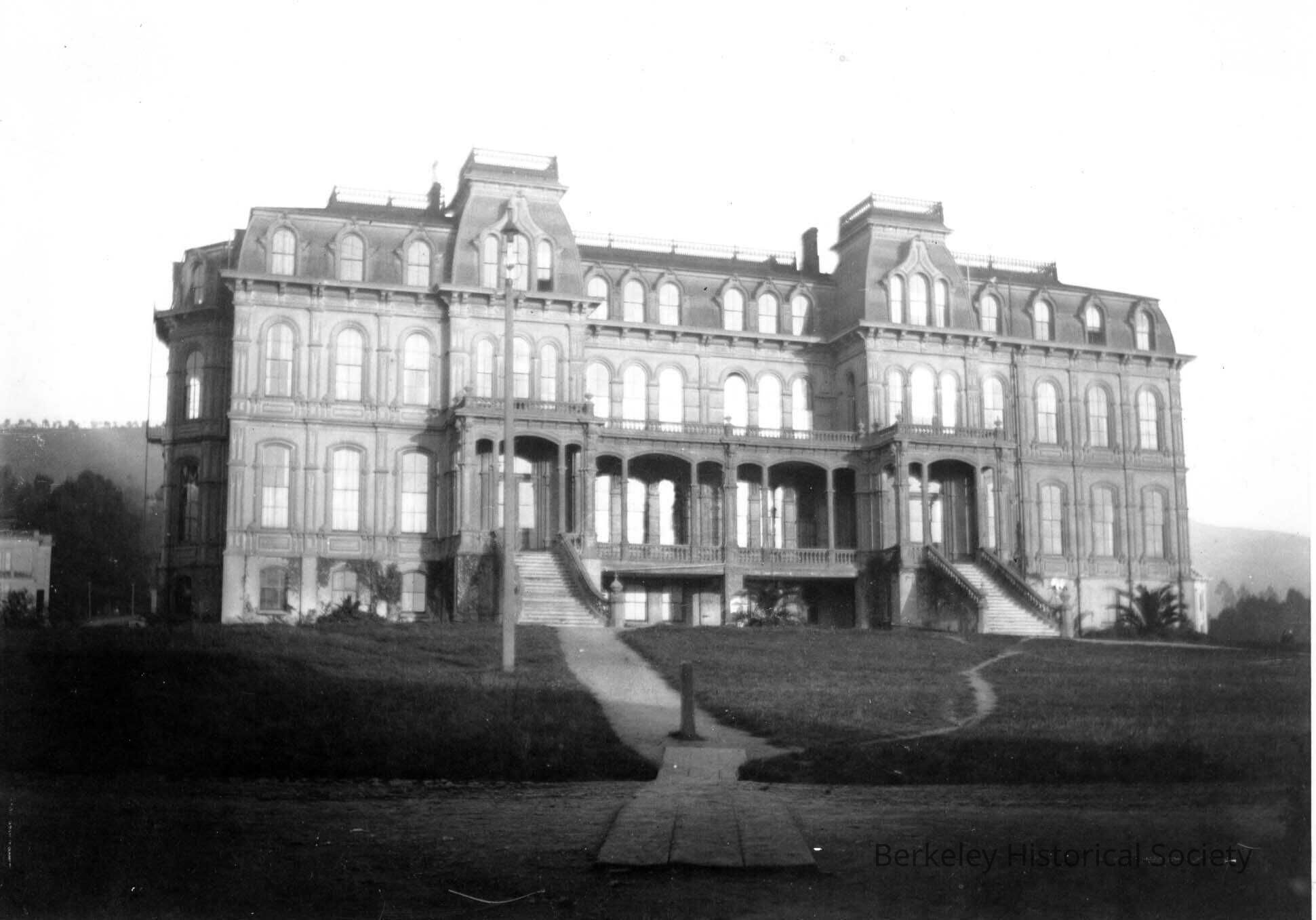 Second of two original buildings; cornerstone laid May 3, 1873; humanities building also housing social sciences, mathematics, engineering (to 1879), offices of President and recorder (to 1898); basement devoted to student activities; upper floors razed (1917) as fire hazard; basement floor roofed and continued in use for student store and ASUC offices (to 1923); used for offices of Dept. of Naval Science (to 1931); razed (1931); site now occupied by Doe Memorial Library.Lexicon
