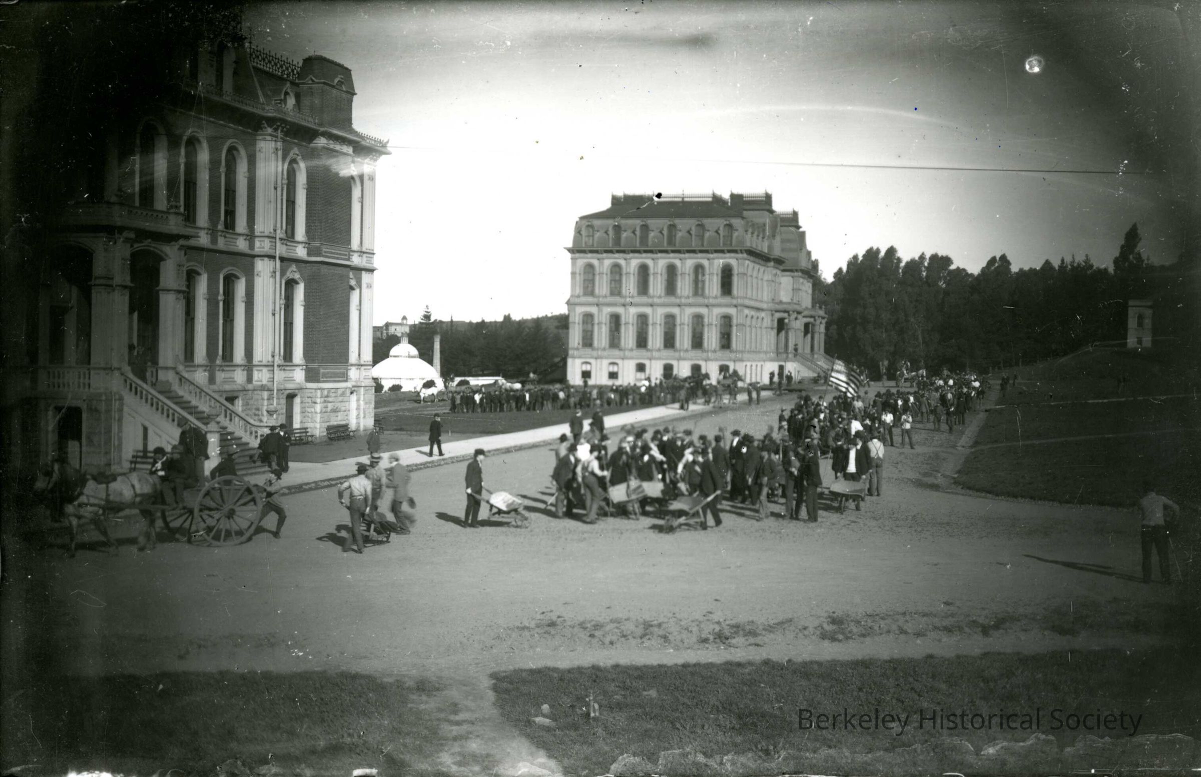 View looking north, with parade of students engaged in unidentified activity. Top of conservatory visible in distance.Made/Created