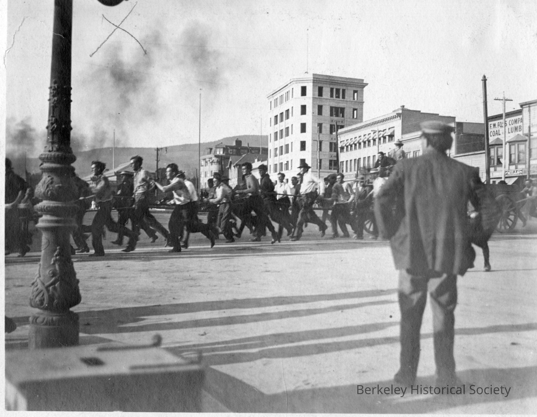 Crossing Shattuck Avenue at Allston Way, looking north across intersection. Students appear to be hauling a wagon.