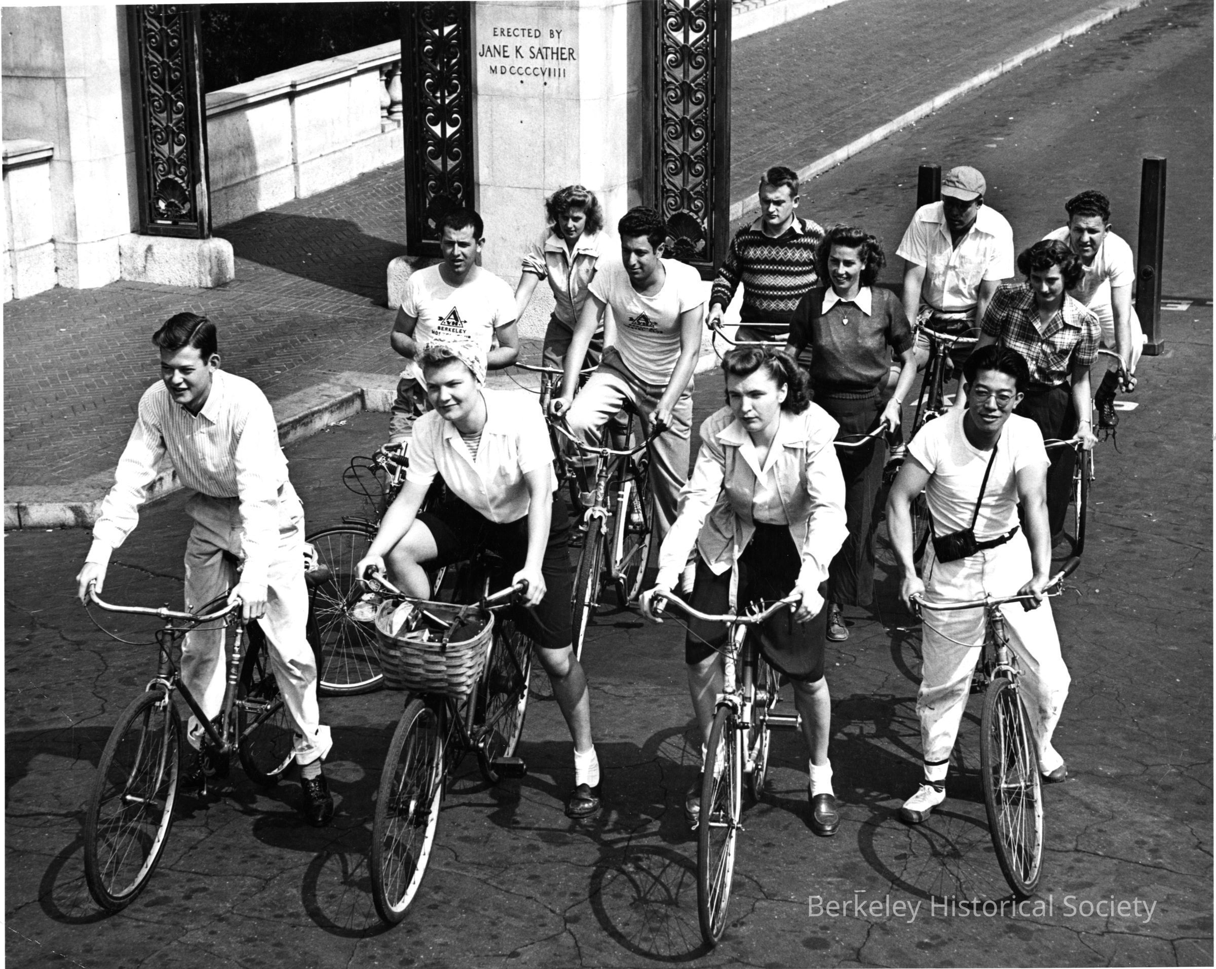 Twelve men and women on bicycles at Sather Gate.Other Names and Numbers